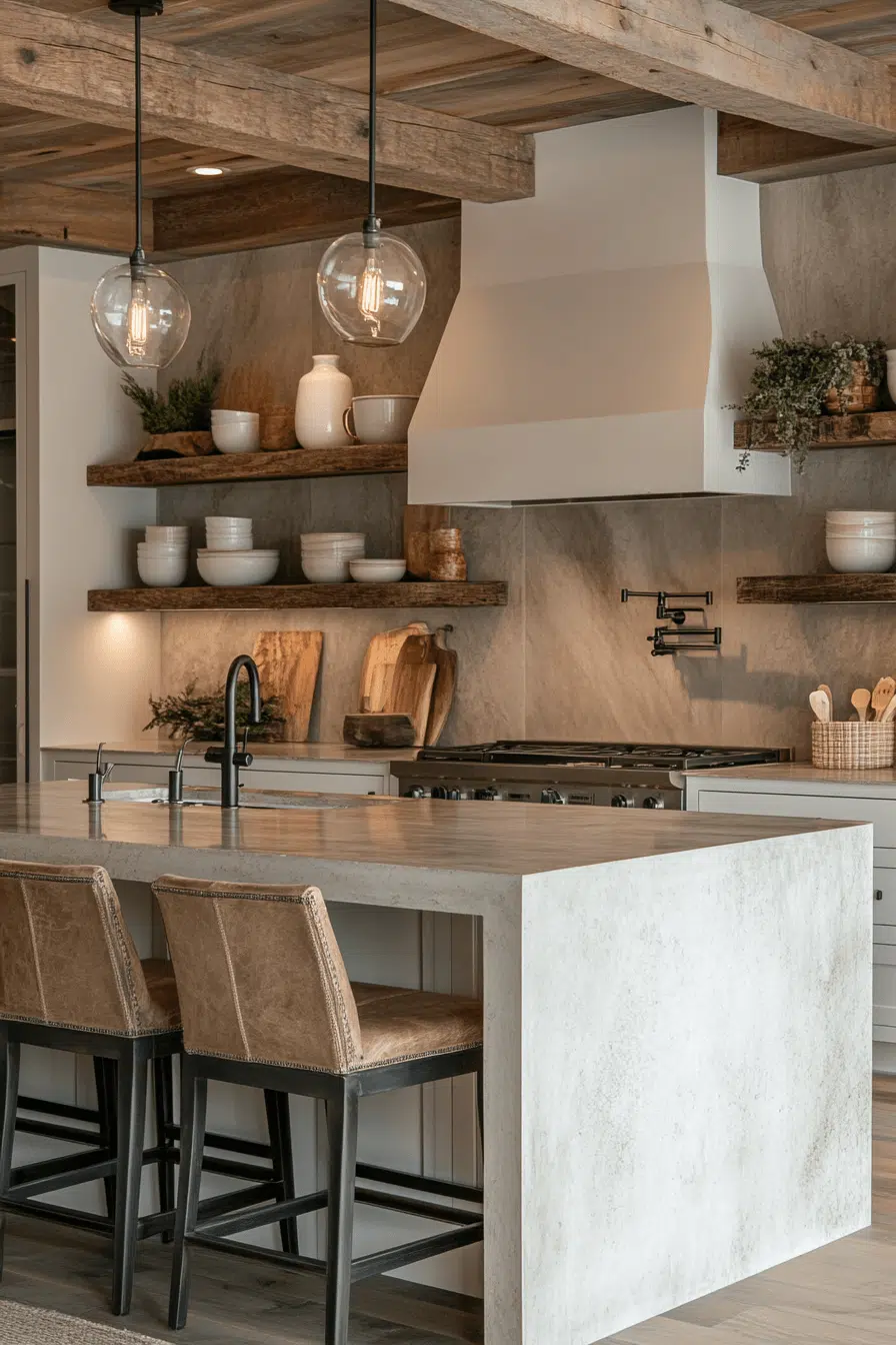 Intentional open shelving is redefining curated simplicity in 2026 kitchen trends. Symmetry and coordinated palettes prevent visual clutter. Wood or stone shelves introduce warmth against streamlined cabinetry. Subtle lighting highlights decorative elements without overpowering them. This style works because it merges personality with restraint. Explore ways to style shelves elegantly.