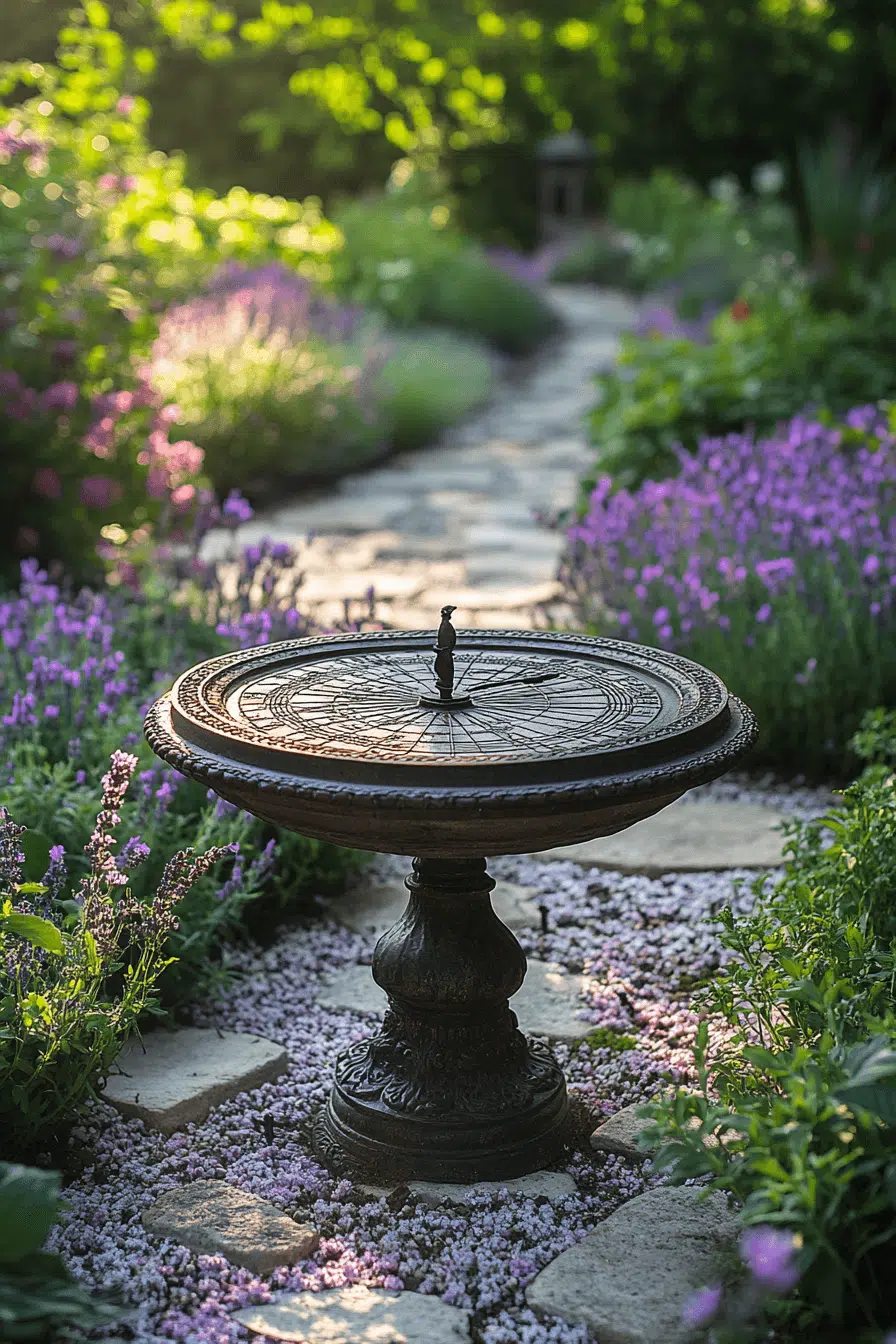Garden artistry deepens when antique yard decor ideas feature traditional sundials placed in open sunlight. Warm metal finishes add subtle glow and symbolic beauty. These timepieces connect design with nature’s rhythm. Fragrant plantings around the base enhance sensory appeal. Function meets ornament effortlessly. Add vintage intrigue to your garden with a classic sundial today.