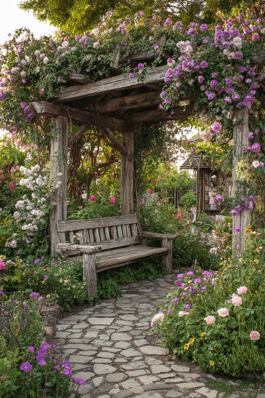 Romantic pathways emerge when antique yard decor ideas incorporate weathered wooden arbors draped in greenery. Climbing florals create shaded passages filled with scent and color. A bench beneath transforms the structure into a peaceful pause. Aged wood textures enhance authenticity. These arbors frame meaningful garden moments. Enhance your garden journey with timeless arbor inspiration today.