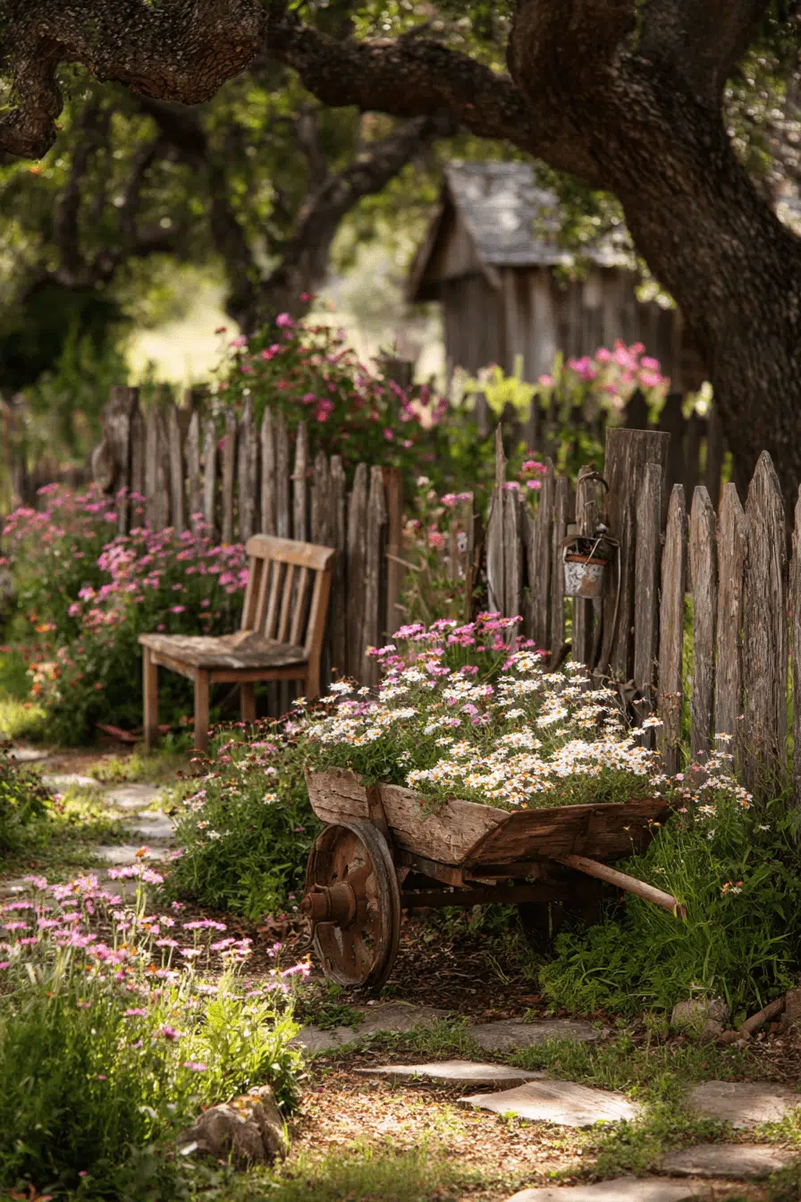 Natural charm unfolds effortlessly when antique yard decor ideas embrace rustic farmhouse influence and aged materials. Weathered wood gates, salvaged fencing, and repurposed garden accents create warmth and personality throughout the landscape. Vintage containers and worn tools transform simple areas into meaningful design moments. Imperfection becomes part of the beauty rather than something to hide. The garden feels welcoming, personal, and authentic. Create a relaxed rustic retreat by gathering farmhouse garden inspiration now.