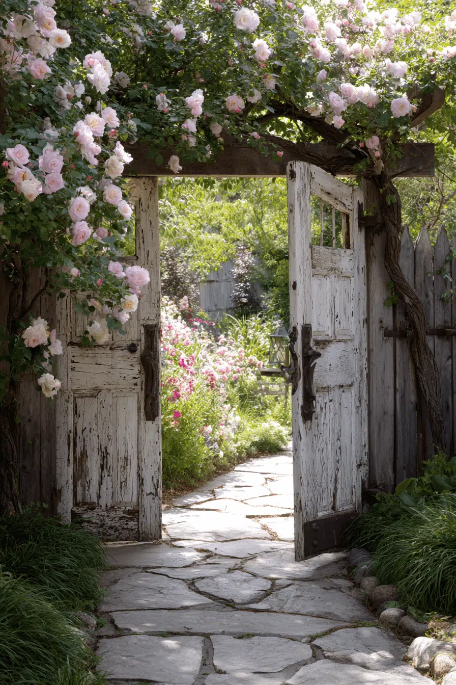 Storybook entrances appear when antique yard decor ideas repurpose salvaged doors as gates. Chipped paint and aged hardware add depth and history. Climbing vines frame the opening naturally. Each doorway feels symbolic and inviting. Sustainability meets storytelling beautifully. Turn reclaimed doors into enchanting garden features today.