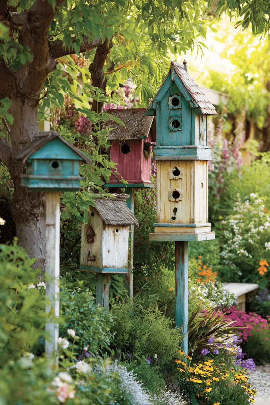 Gentle charm spreads throughout landscapes when antique yard decor ideas include cottage-style birdhouses. Decorative architecture attracts birds while adding visual warmth. Thoughtful placement encourages wildlife visits. Seasonal beauty evolves naturally. These accents feel cozy and functional. Add storybook charm with vintage birdhouse inspiration now.