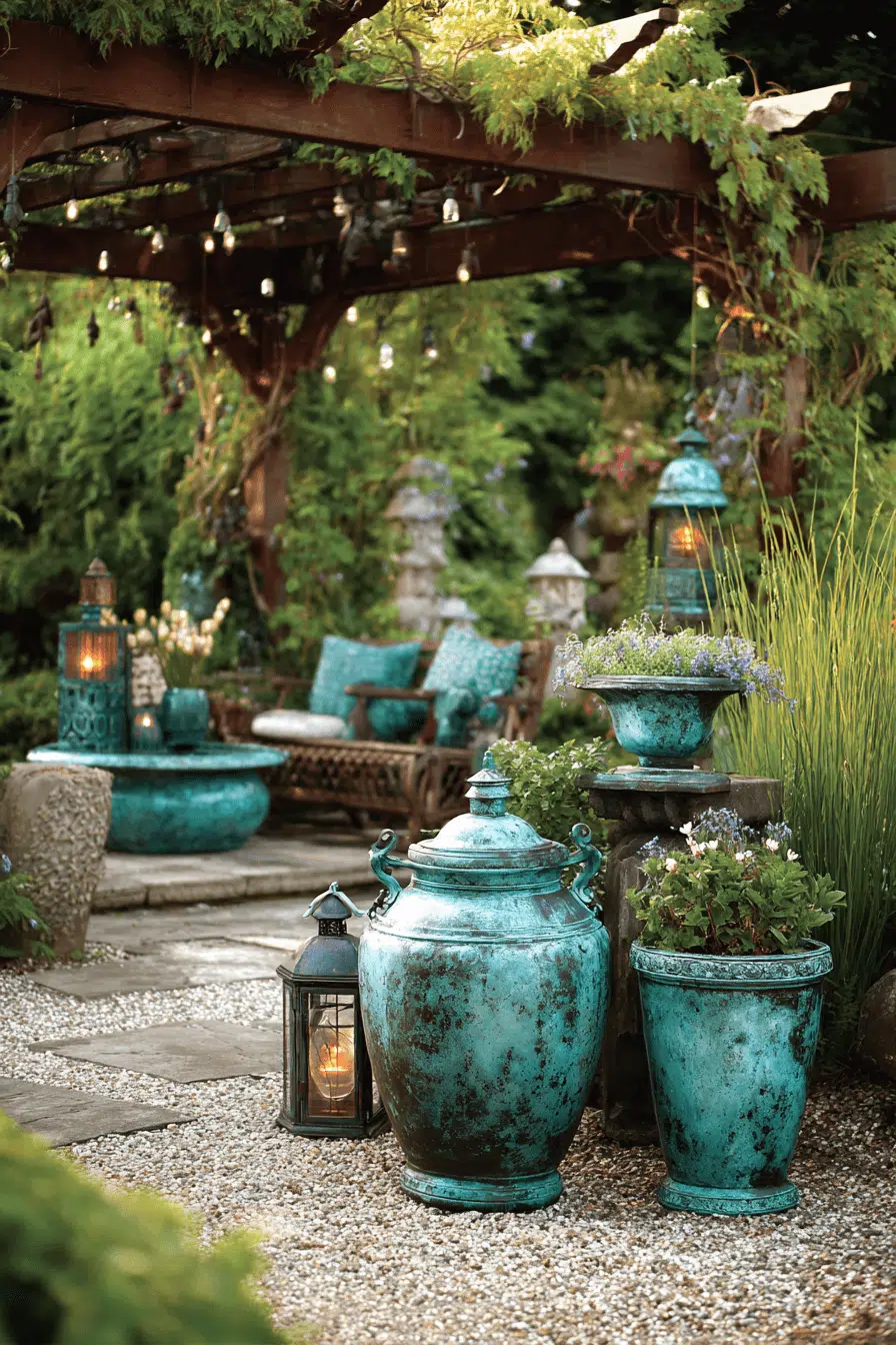 Metallic warmth glows softly when antique yard decor ideas feature weathered copper accents. Lanterns and planters develop patina over time. Changing hues enhance greenery and stone. These pieces feel rich yet understated. Durability meets beauty seamlessly. Introduce copper details and elevate your garden atmosphere today.