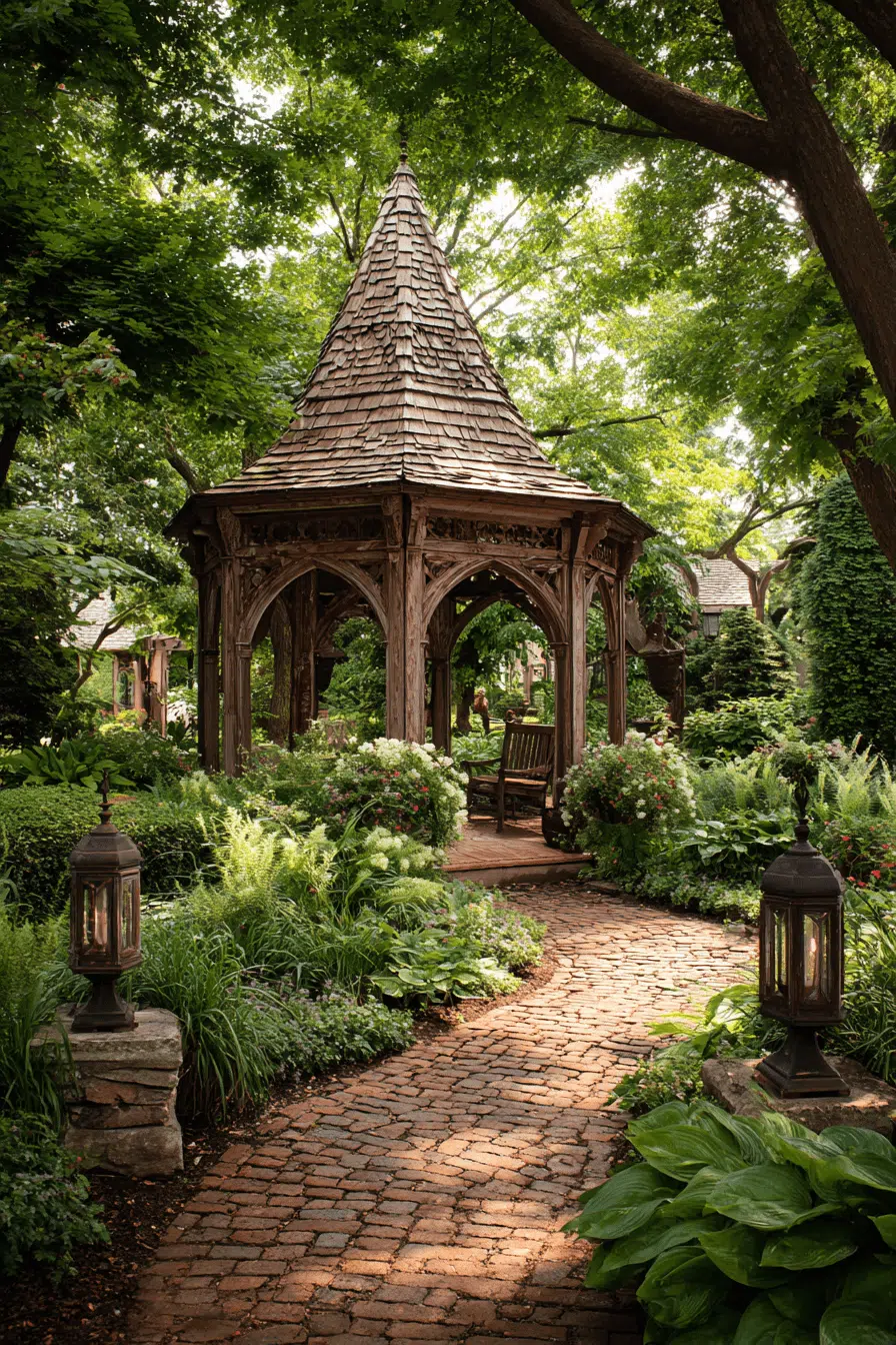 Outdoor spaces gain romance and presence when antique yard decor ideas include historic gazebo designs as focal points. Iron scrollwork or carved wooden structures offer shade while adding architectural interest. Climbing vines soften the framework and create lush movement. Vintage furnishings beneath the structure invite lingering moments of rest. These gazebos transform open yards into intentional destinations. Design a charming garden centerpiece and explore gazebo inspiration now.
