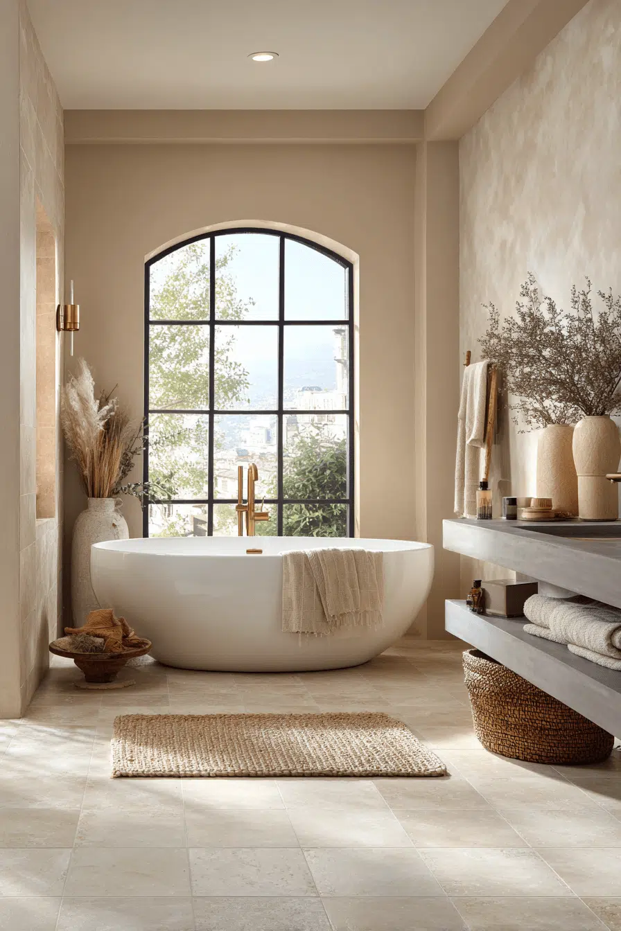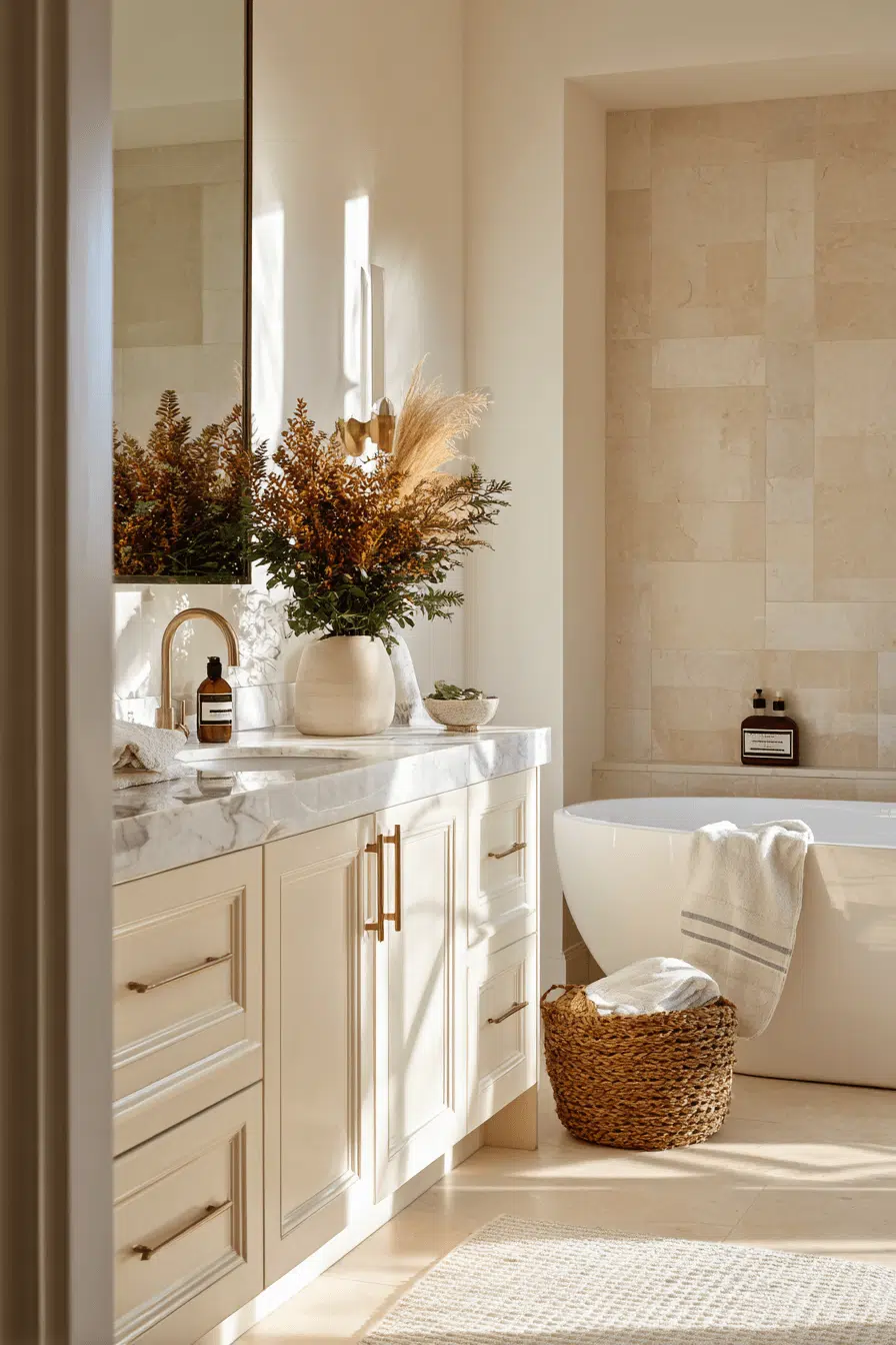 Pale cream tones layered thoughtfully can turn a simple room into a cozy bathroom oasis. When similar shades are stacked together, the result feels airy yet warm. Soft metallic accents add a subtle shimmer. Rounded decor and plush textiles soften the overall look. The vibe remains timeless and calming. Bring this gentle palette into your bathroom today.