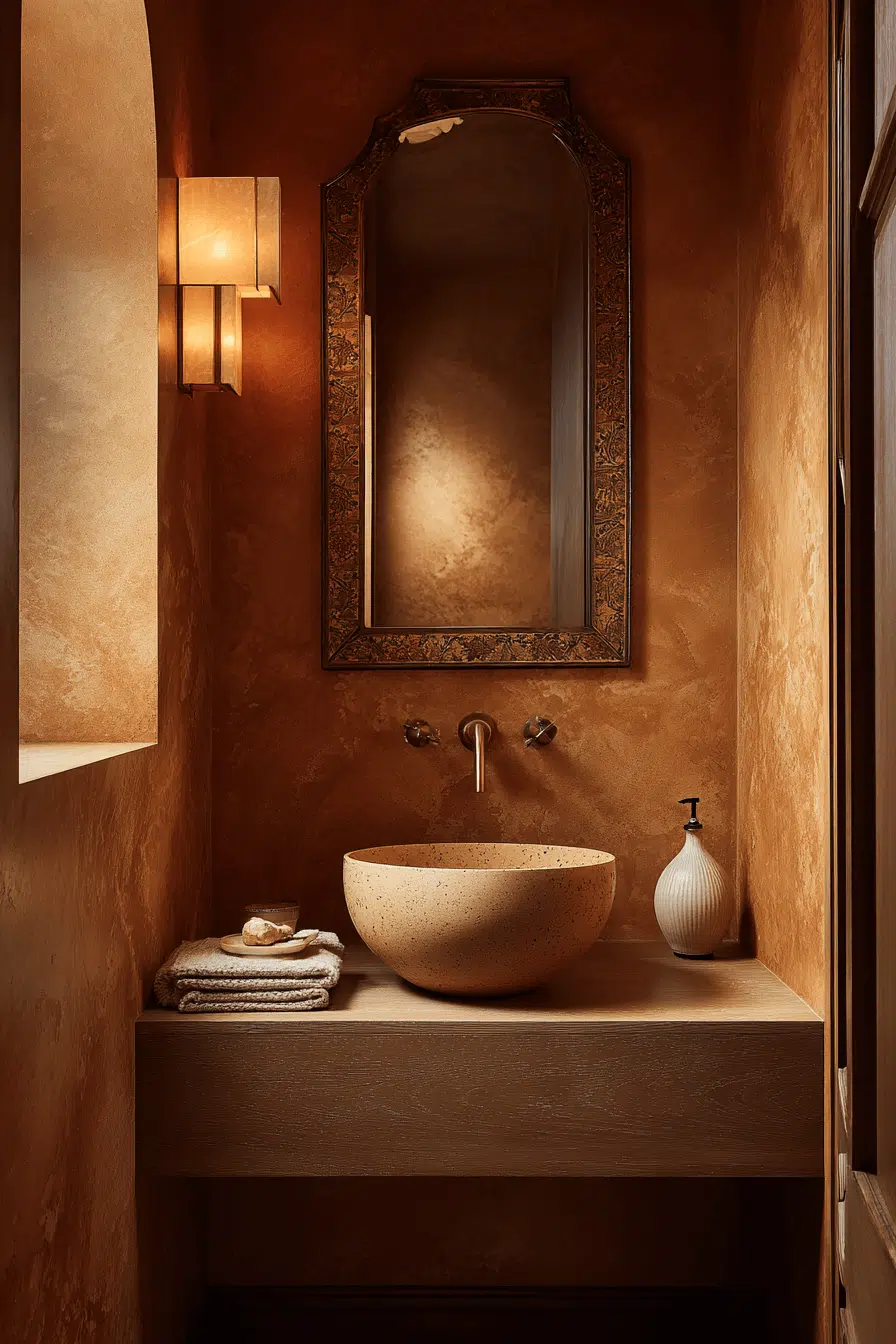 Deep caramel and espresso tones can create a cozy bathroom that feels enveloping and intimate. These rich shades add personality while still maintaining warmth. When balanced with soft lighting and natural textures, the mood stays welcoming rather than heavy. Layered fabrics enhance the sense of comfort. The result feels bold yet beautifully grounded. Explore how darker hues can redefine your bathroom now.