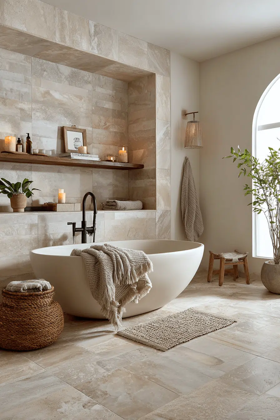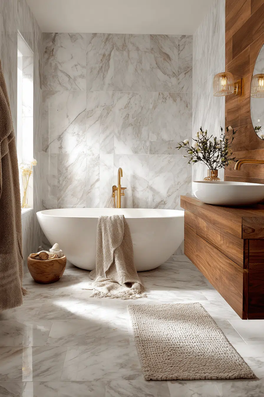 Stone surfaces can feel wonderfully inviting when styled intentionally in a cozy bathroom. Choose warmer veining and pair it with soft fabrics. Wooden accents balance the coolness beautifully. Ambient lighting ties everything together. The look blends luxury with approachability. Elevate your marble styling with these ideas today.