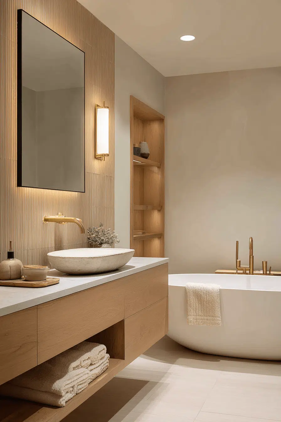 Wood elements instantly infuse a cozy bathroom with organic warmth. A floating vanity or wood framed mirror highlights natural grain patterns. Creamy tiles keep the look balanced. Soft lighting enhances every detail. The blend feels timeless and grounded. Introduce more natural beauty into your bathroom today.