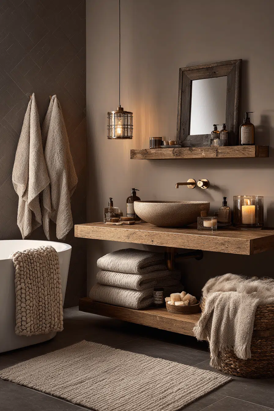 Earthy tones and layered textiles combine for a cozy bathroom that feels emotionally comforting. Warm illumination adds glow throughout. Natural accents keep the palette dynamic. The space feels like a retreat from everyday stress. Comfort and style merge beautifully. Refresh your bathroom with this inviting energy now.