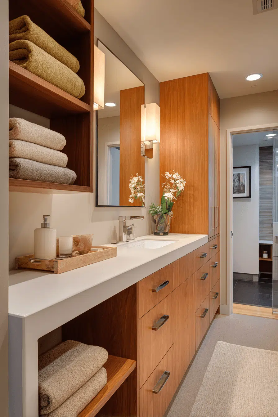 Layering tactile materials can completely redefine a cozy bathroom atmosphere. Think textured tile, woven storage, and plush runners working together. These details soften hard surfaces and invite relaxation. Even sleek cabinetry feels warmer when paired with texture. The visual interest makes the room feel styled yet approachable. Add more dimension to your bathroom today.
