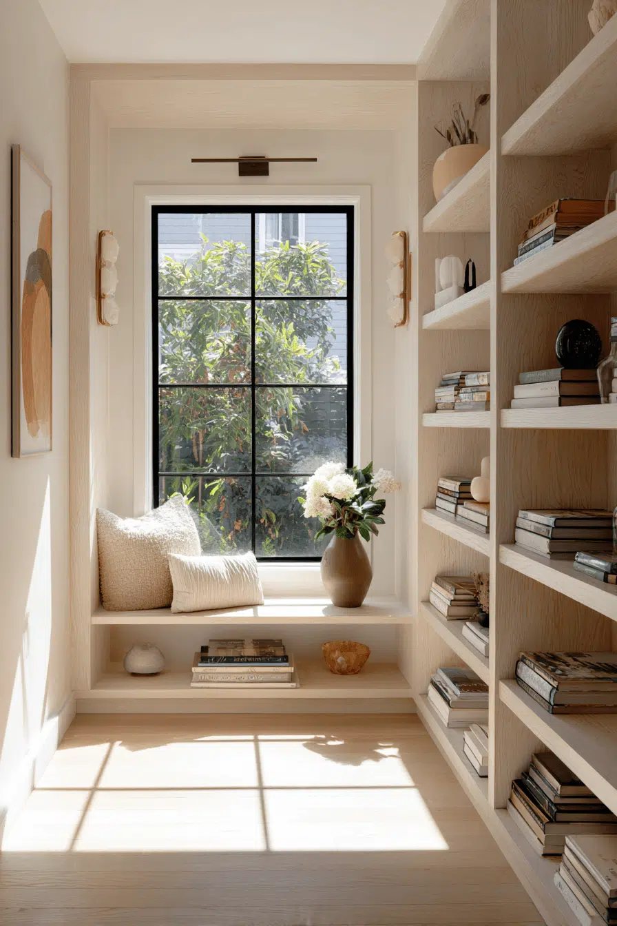 Window-framed shelving brightens bookshelves for small spaces by blending storage with natural light. Placement near windows allows sunlight to filter through beautifully. Light finishes amplify the airy effect. Shelves provide storage without blocking openness. Thoughtful styling maintains balance. The space feels fresh and inviting. Add brightness to your shelving design today!