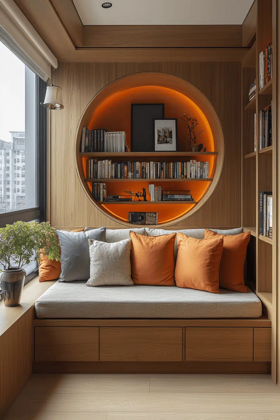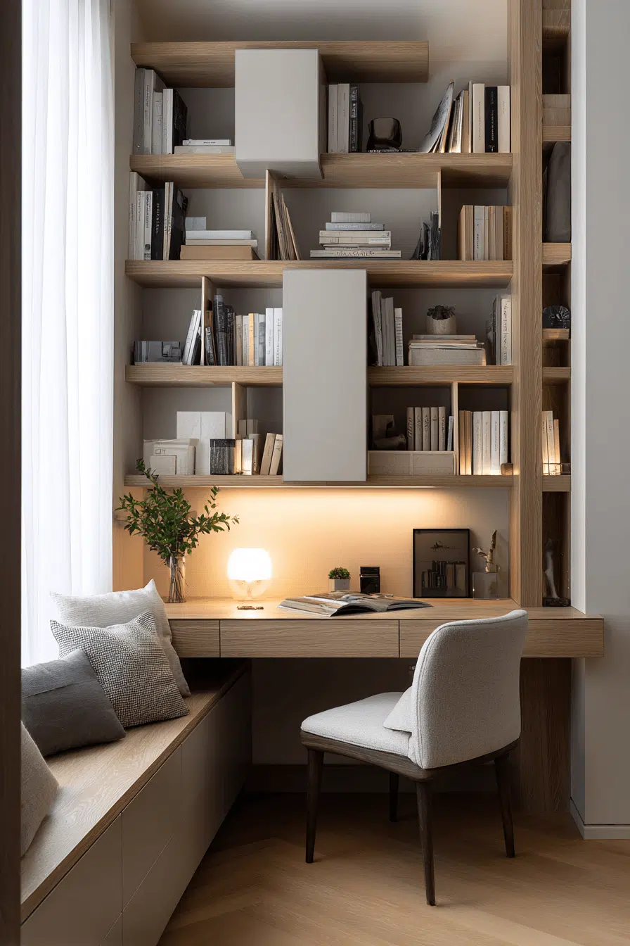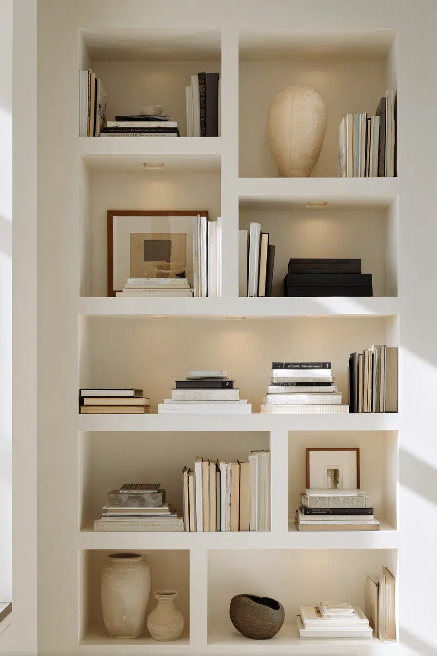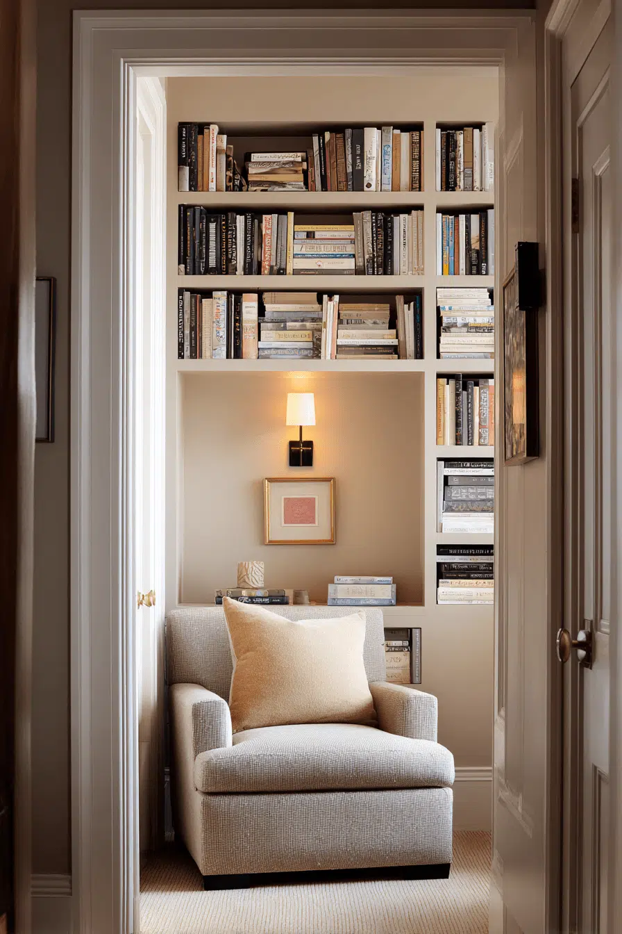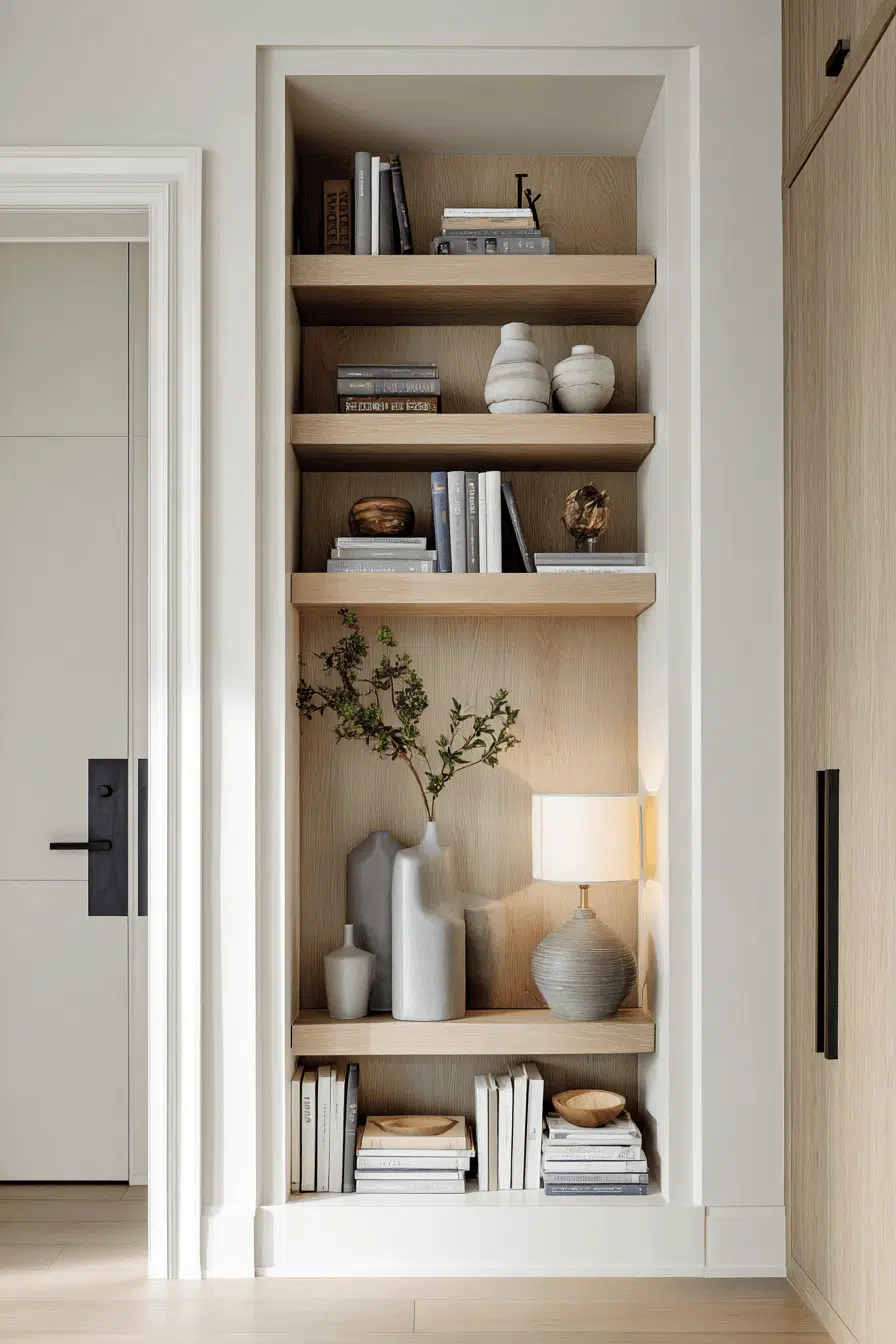 Recessed nook shelving enhances bookshelves for small spaces by integrating storage directly into the wall for a seamless look. Built-in designs eliminate bulk and maximize every inch. Neutral finishes keep everything cohesive. Books and decor feel naturally placed within the structure. The layout remains uncluttered and efficient. The result feels tailored and polished. Upgrade your space with this built-in solution today!