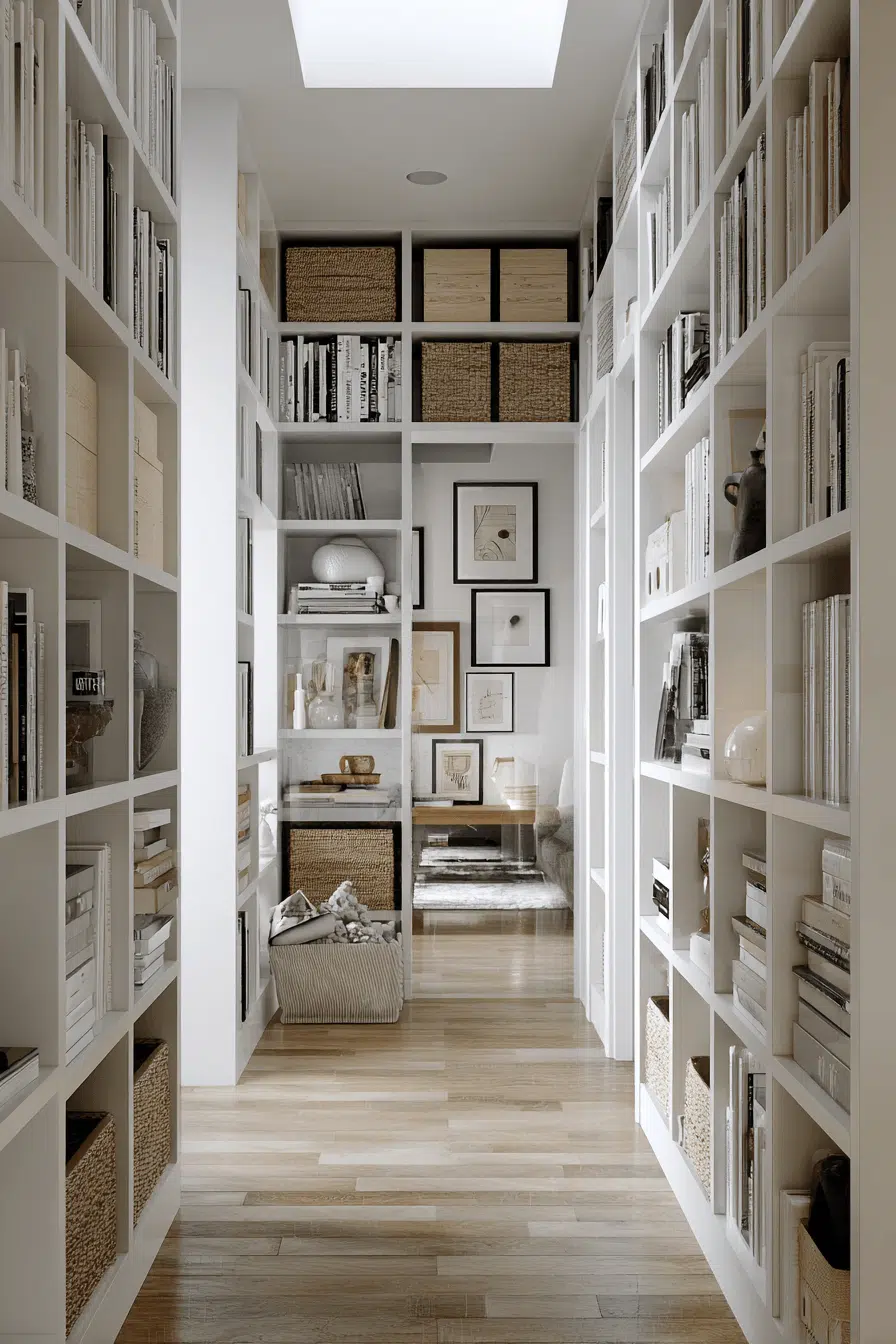 Slim hallway shelving improves bookshelves for small spaces by utilizing narrow areas without interrupting movement. Compact designs fit neatly along walls while maintaining flow. Light tones keep the space feeling open and bright. Books and decor can be arranged neatly for a curated display. Vertical orientation maximizes storage. The result feels efficient and stylish. Upgrade your hallway storage with ease today!