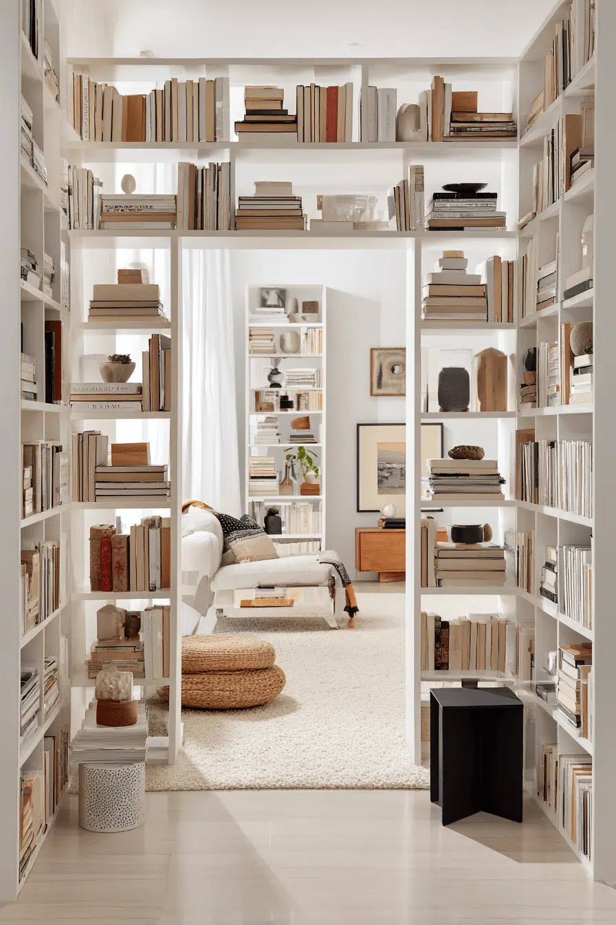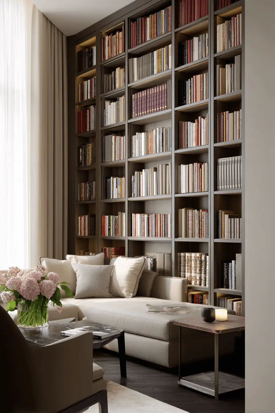 Library-style wall shelving transforms bookshelves for small spaces into a bold focal point with full-height storage. Vertical layouts maximize capacity. Structured designs keep everything organized. Neutral tones maintain balance. Thoughtful styling adds personality. The result feels impressive yet practical. Create your own library-inspired wall today!