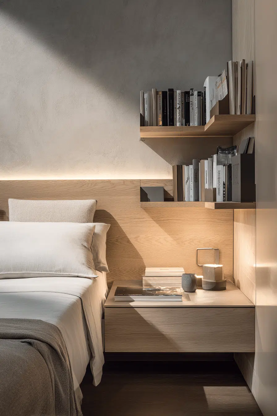 Bedside shelving designs improve bookshelves for small spaces by offering compact storage within reach. Shelves replace bulky furniture while keeping essentials nearby. Clean lines maintain a clutter-free aesthetic. Durable materials add both function and style. Built-in lighting enhances usability. The layout feels efficient and modern. Upgrade your bedside setup today!