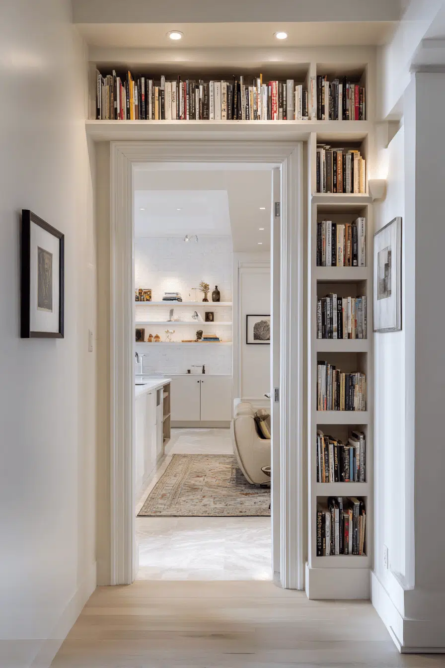 Above-door shelving expands bookshelves for small spaces by using overlooked vertical space efficiently. Slim designs keep everything minimal. Elevated placement keeps items organized and out of the way. Neutral tones blend seamlessly. Ideal for tight areas needing extra storage. The setup feels clever and efficient. Make use of hidden space today!
