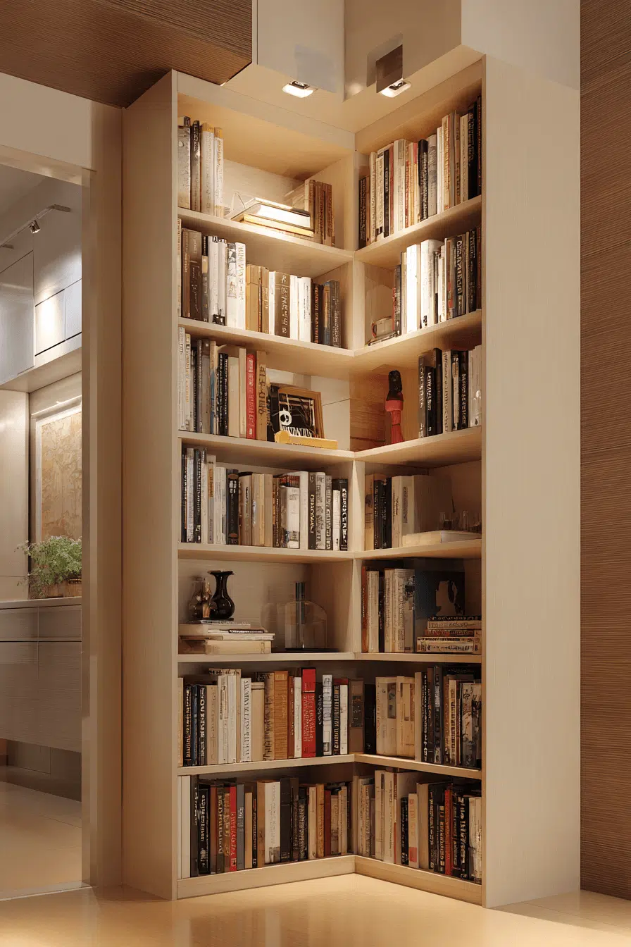 Corner shelving units optimize bookshelves for small spaces by fitting perfectly into unused corners. Vertical designs add height and dimension. Neutral finishes blend with existing decor. Open shelving keeps everything accessible. Compact footprints suit tight layouts. The result feels balanced and efficient. Maximize your corners with this idea today!
