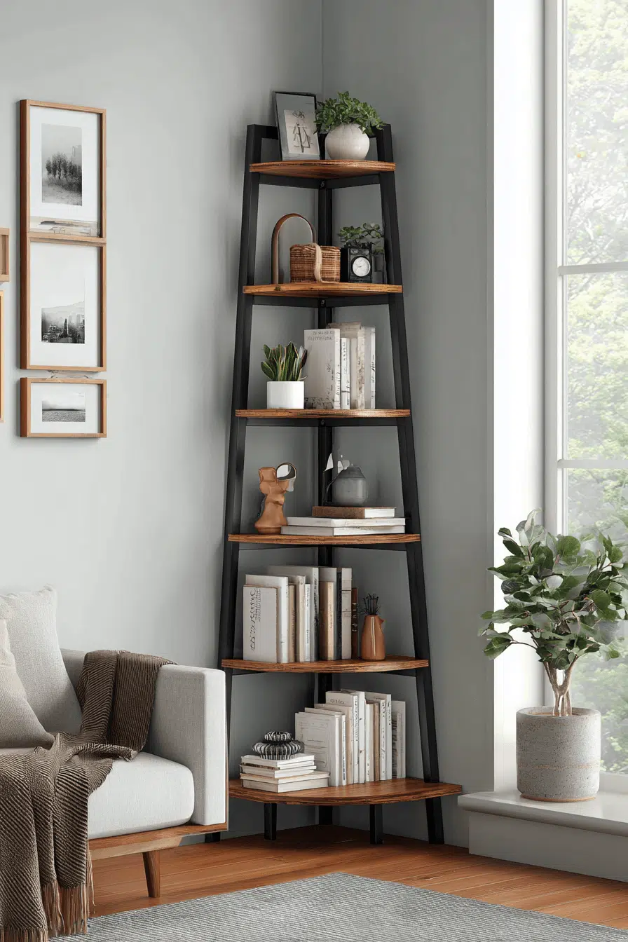 Corner ladder shelving upgrades bookshelves for small spaces by making use of overlooked corners in a stylish way. Open, angled designs add height while maintaining a light visual footprint. Warm wood or matte finishes blend seamlessly into various interiors. Tiered shelves allow for layered styling with books and decor. Compact sizing makes it perfect for tighter areas. The result feels practical and visually appealing. Turn your unused corners into functional features today!