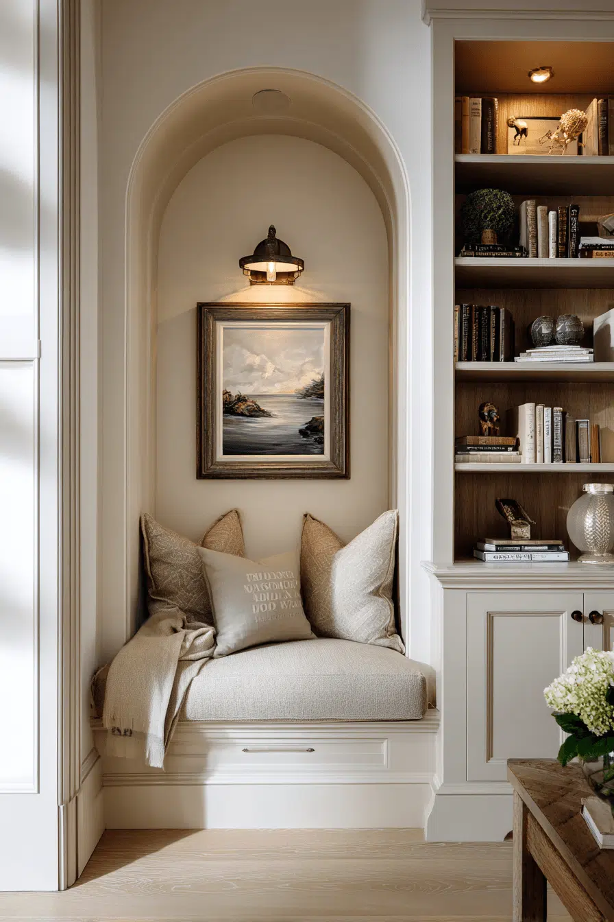 Alcove shelving upgrades bookshelves for small spaces by turning recessed areas into functional storage features. Built-in designs create a seamless appearance. Neutral finishes maintain cohesion. The structure saves space while adding depth. Styling enhances visual appeal. The space feels integrated and polished. Transform your alcove into something beautiful today!