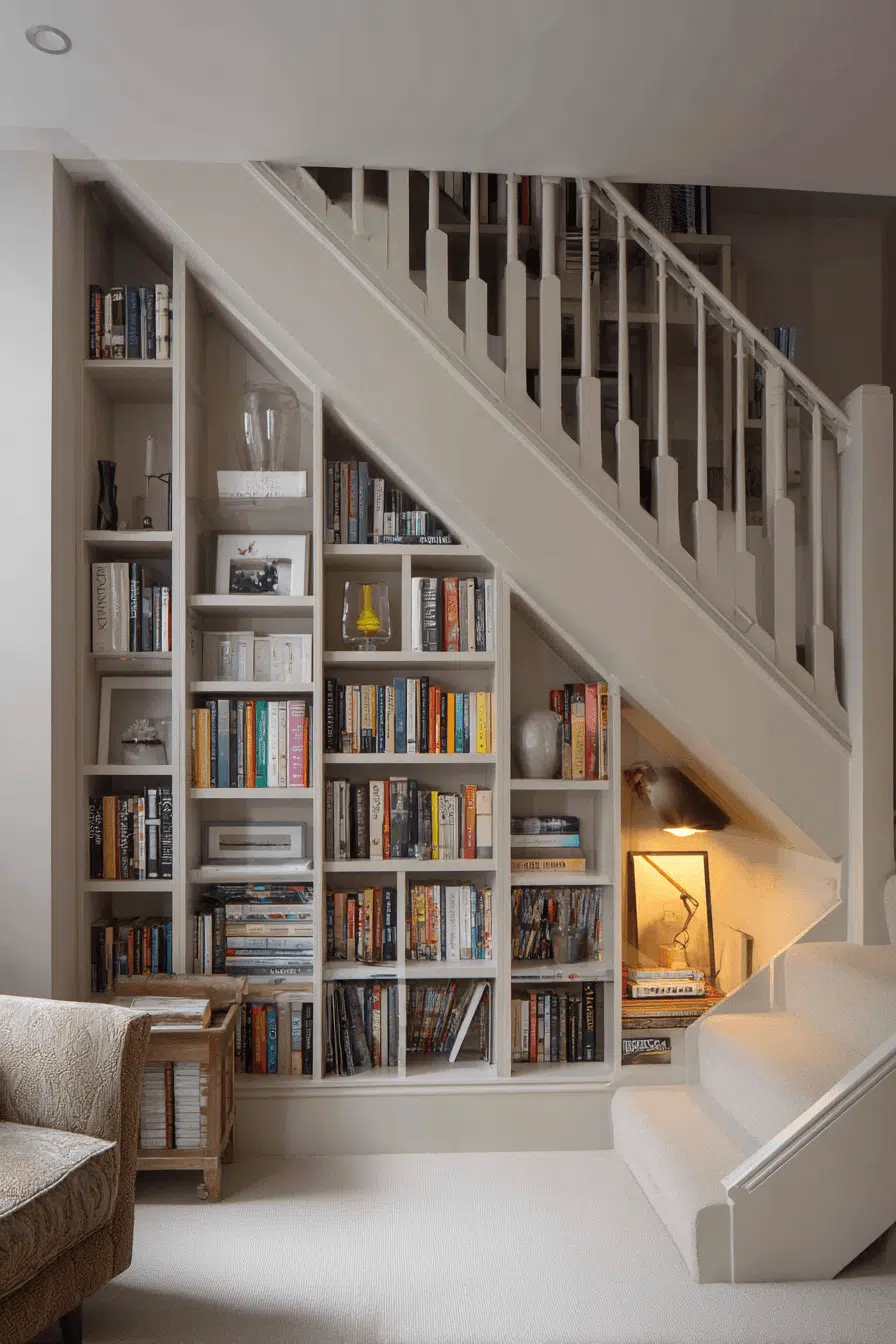 Under-stair storage brings creativity to bookshelves for small spaces by turning unused areas into functional shelving zones. Custom-fit designs make the most of awkward layouts. Clean lines maintain a tidy and structured appearance. Neutral tones help the shelves blend into the home. Varied heights provide flexibility for different items. The setup feels unique and efficient. Unlock hidden storage potential in your home today!