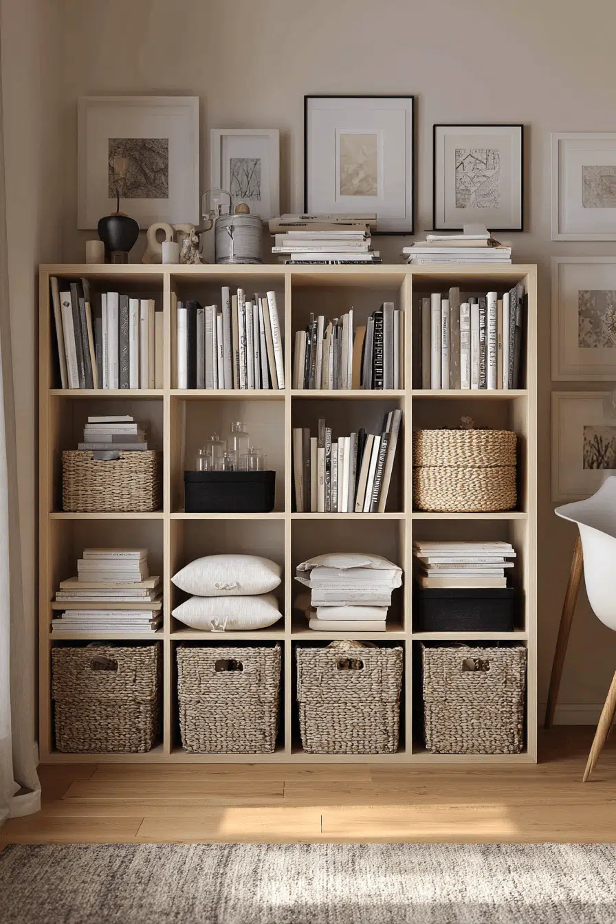 Cube shelving systems modernize bookshelves for small spaces with a clean, grid-style layout that offers flexibility and organization. Individual compartments make sorting easy and visually appealing. Contemporary finishes keep everything fresh and stylish. The modular structure adapts to different room layouts. Storage bins can be added for hidden organization. The design feels balanced and versatile. Create a shelving system that works for you today!