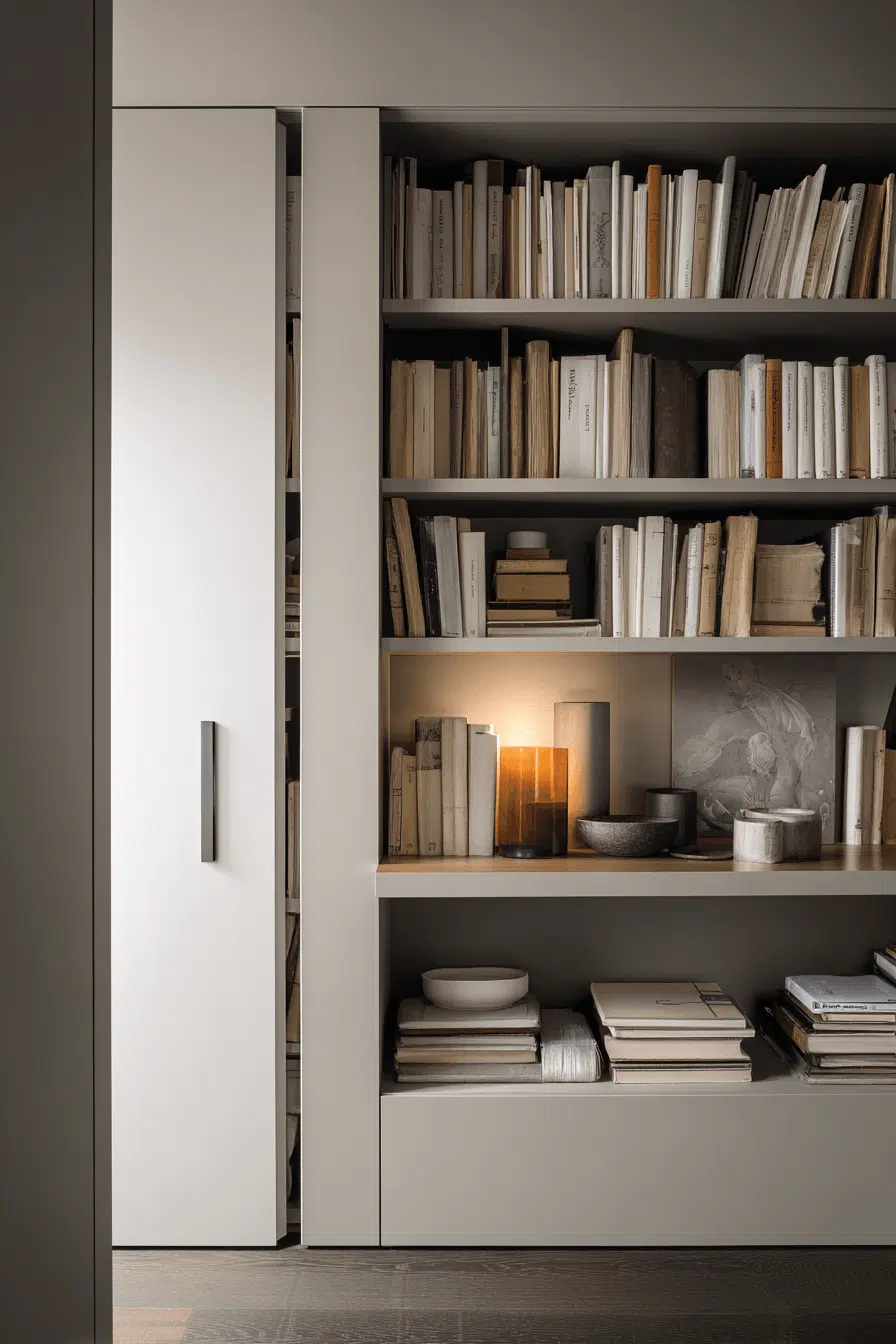 Flush wall shelving refines bookshelves for small spaces with a built-in look that keeps the room streamlined. Shelves sit neatly within the wall. Neutral tones enhance the modern aesthetic. Custom layouts fit different needs. Storage remains functional without crowding the space. The room feels clean and polished. Achieve a sleek built-in style today!