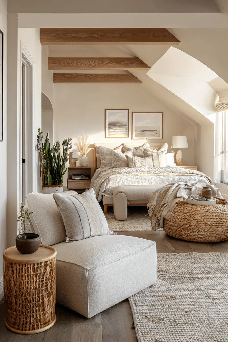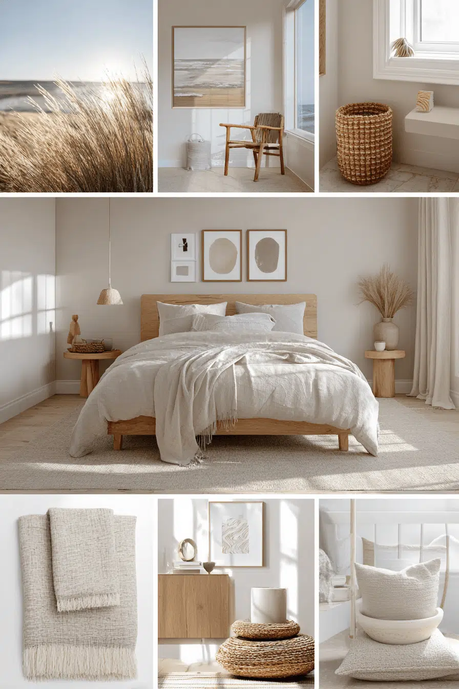 Dune-inspired neutrals shape this beach house bedroom with soft beige and ivory tones that feel grounded and soothing. Minimal decor keeps the layout open. Natural wood enhances the organic feel. Textured fabrics add depth. Sunlight softens the design. The space feels restful and balanced. Explore this calming beach house bedroom!
