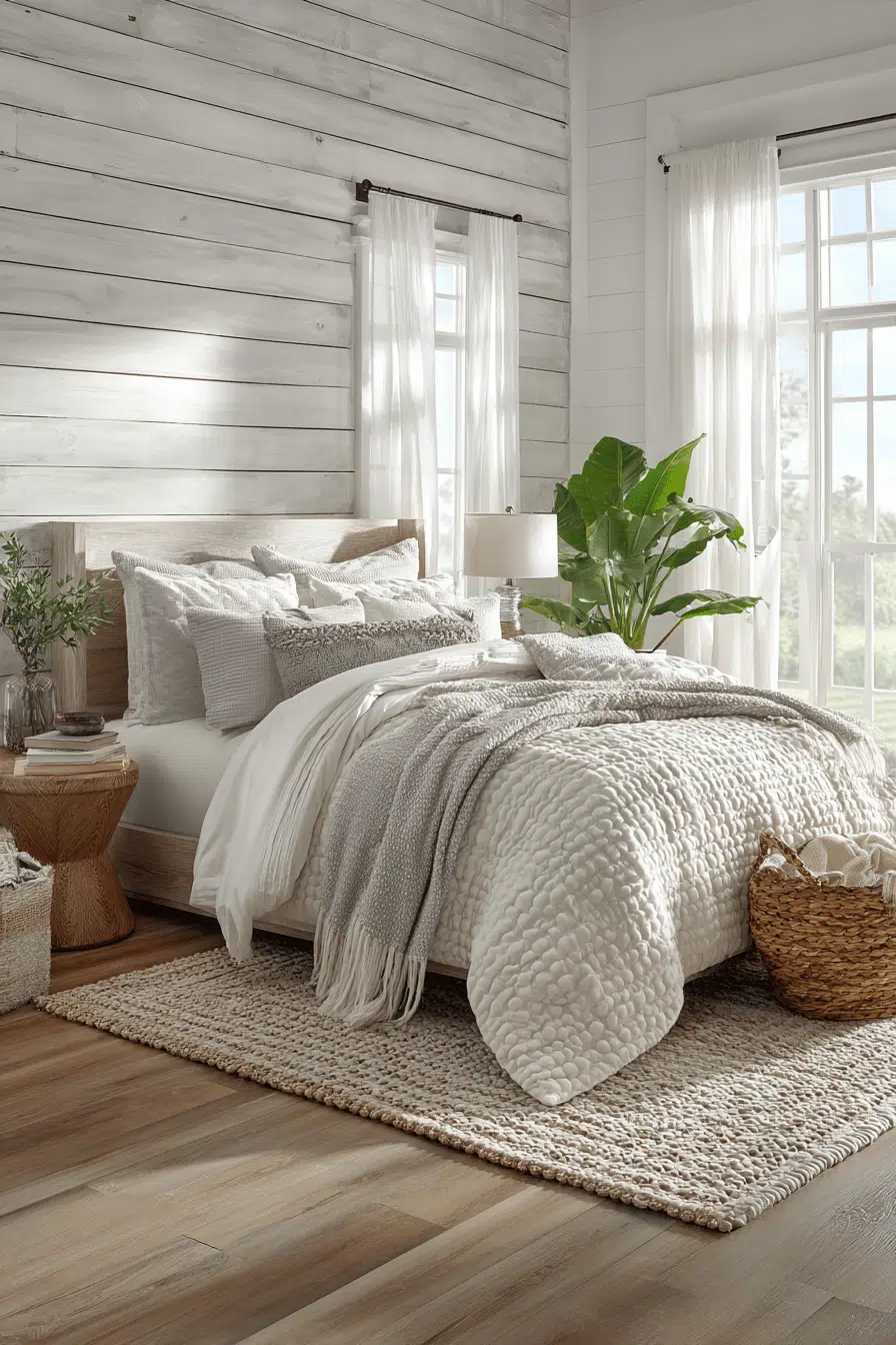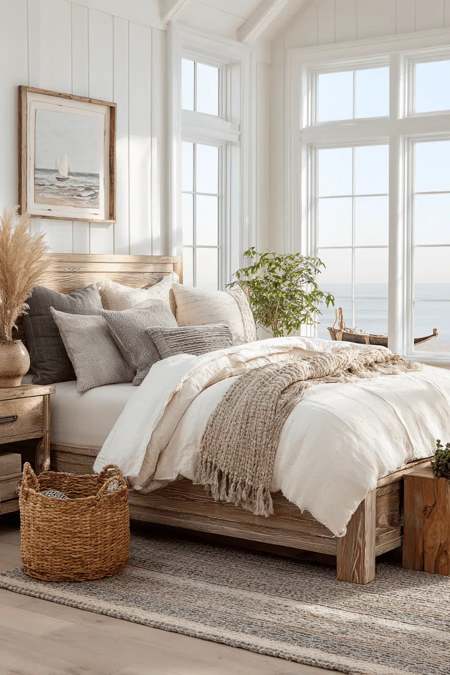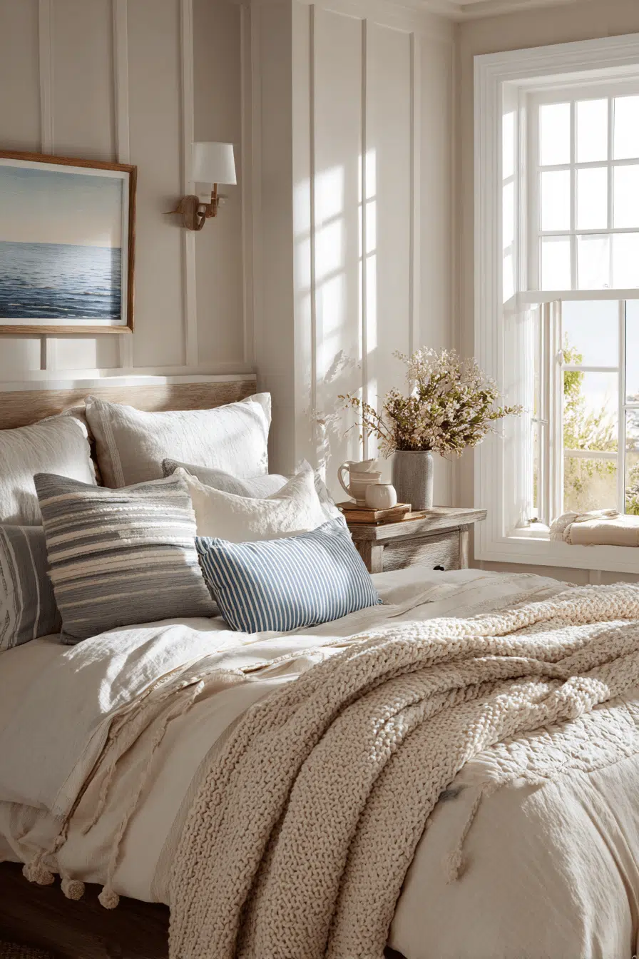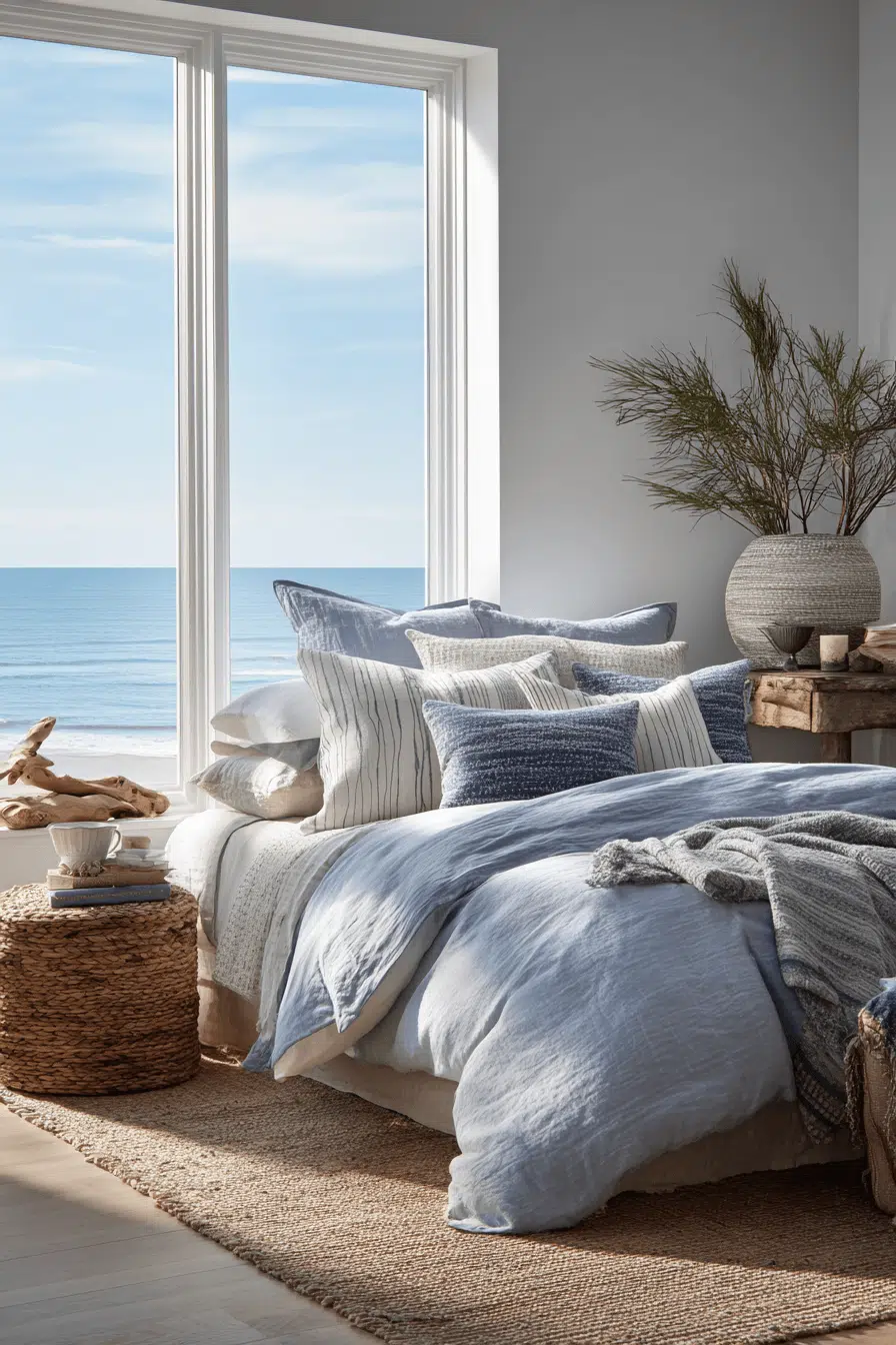 Cozy layering transforms this beach house bedroom into a warm and inviting retreat filled with soft textures. Neutral tones create a balanced palette. Natural materials add authenticity. Light softens the space beautifully. The room feels comfortable and relaxing. The atmosphere is peaceful. Explore this cozy beach house bedroom!
