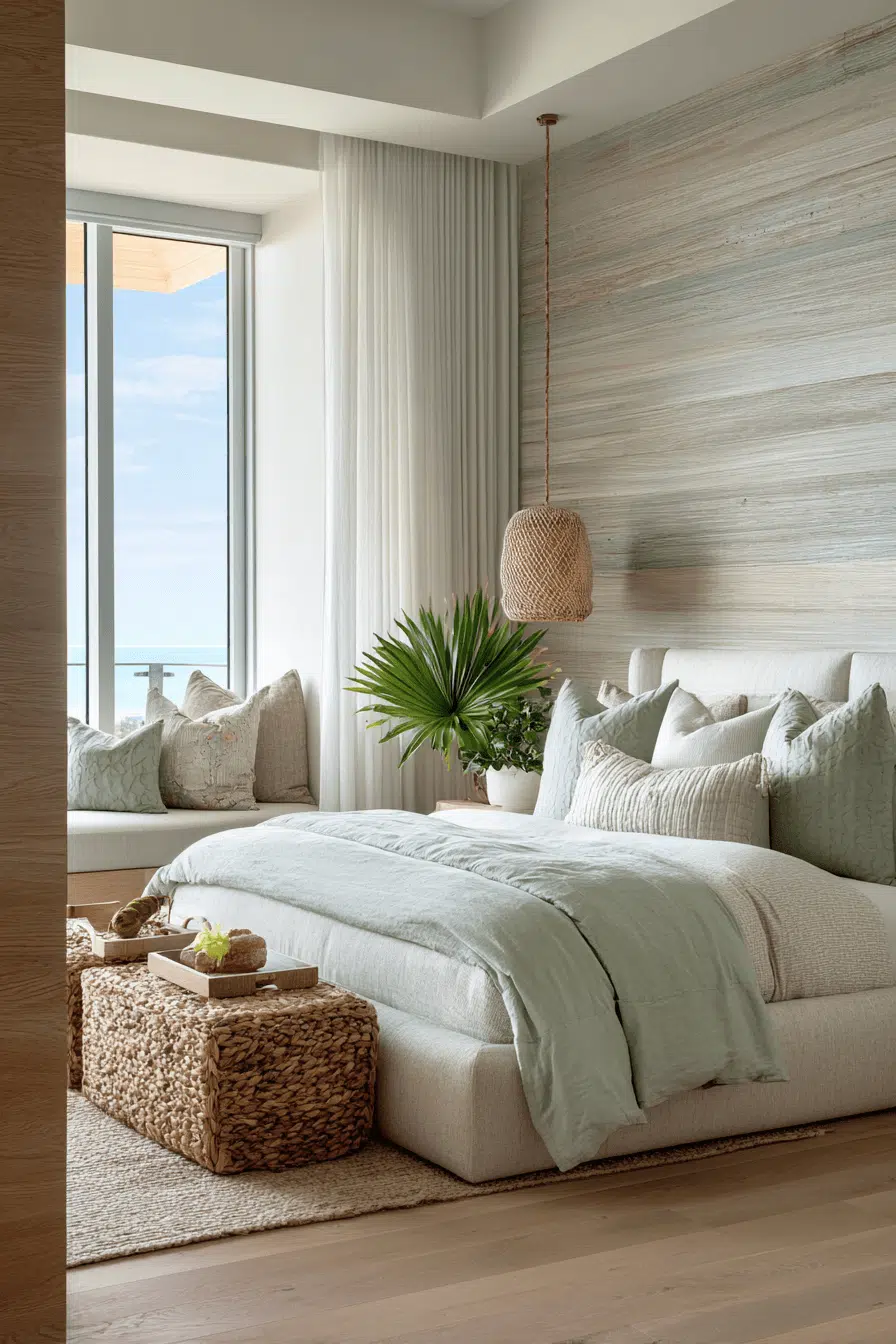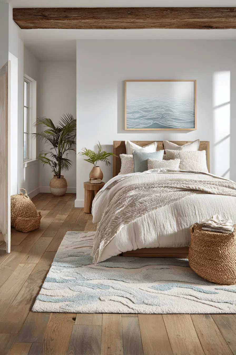 Ripple-inspired textures bring subtle movement into this beach house bedroom through soft patterns and layered fabrics. Neutral tones keep the design cohesive. Natural materials add warmth. Light enhances the details beautifully. The space feels dynamic yet calm. The atmosphere remains serene. Discover this textured beach house bedroom!