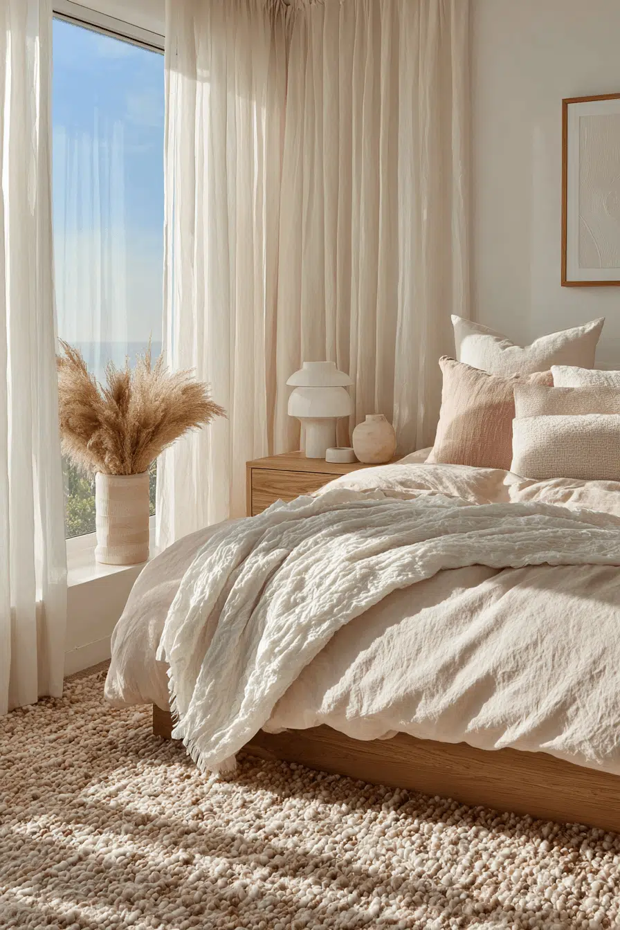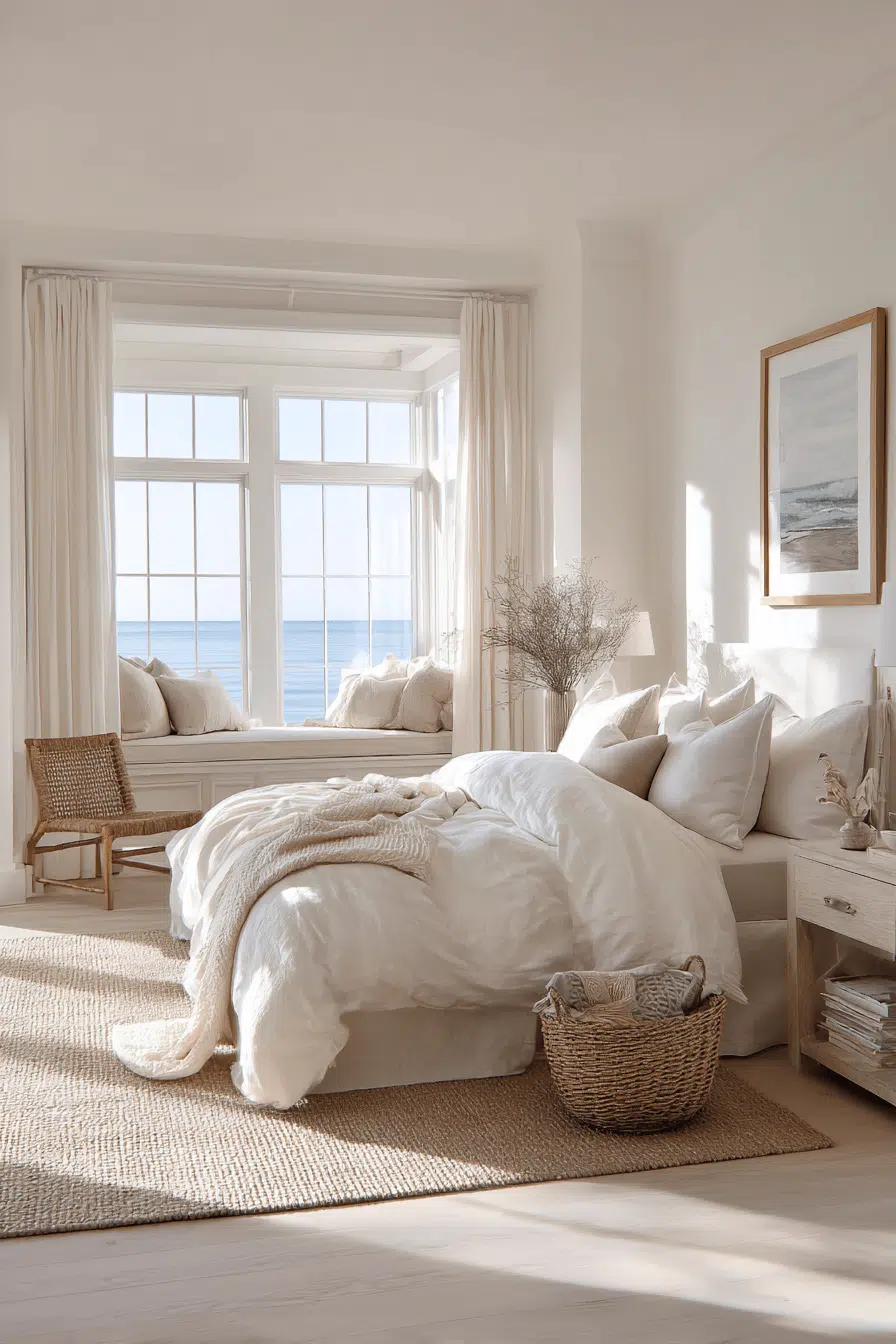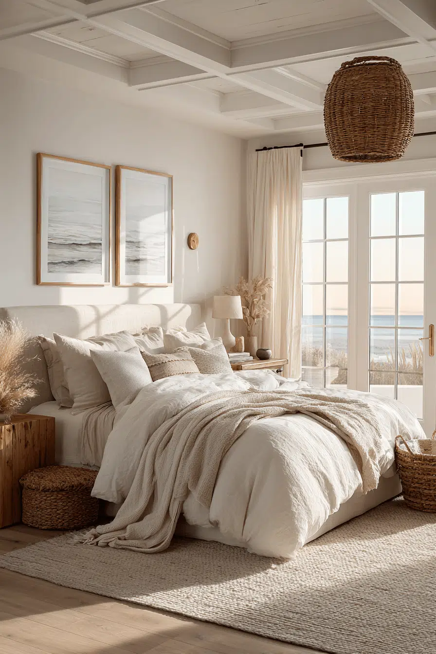Shell-inspired tones add a delicate elegance to this beach house bedroom through soft hues and textures. Light fabrics create movement and softness. Natural materials balance the palette. Minimal styling keeps the design refined. Sunlight enhances the warm tones. The space feels graceful and calm. Discover this elegant beach house bedroom!
