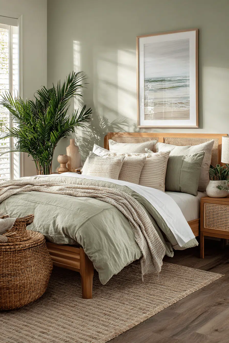 Palm-inspired details add a subtle tropical touch to this beach house bedroom through natural textures and soft greens. Light fabrics enhance movement. Minimal styling keeps the space uncluttered. Natural materials add warmth. The room feels breezy and relaxed. The atmosphere is inviting. Browse this tropical beach house bedroom!