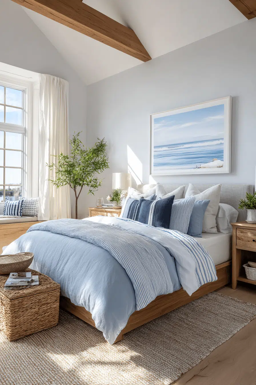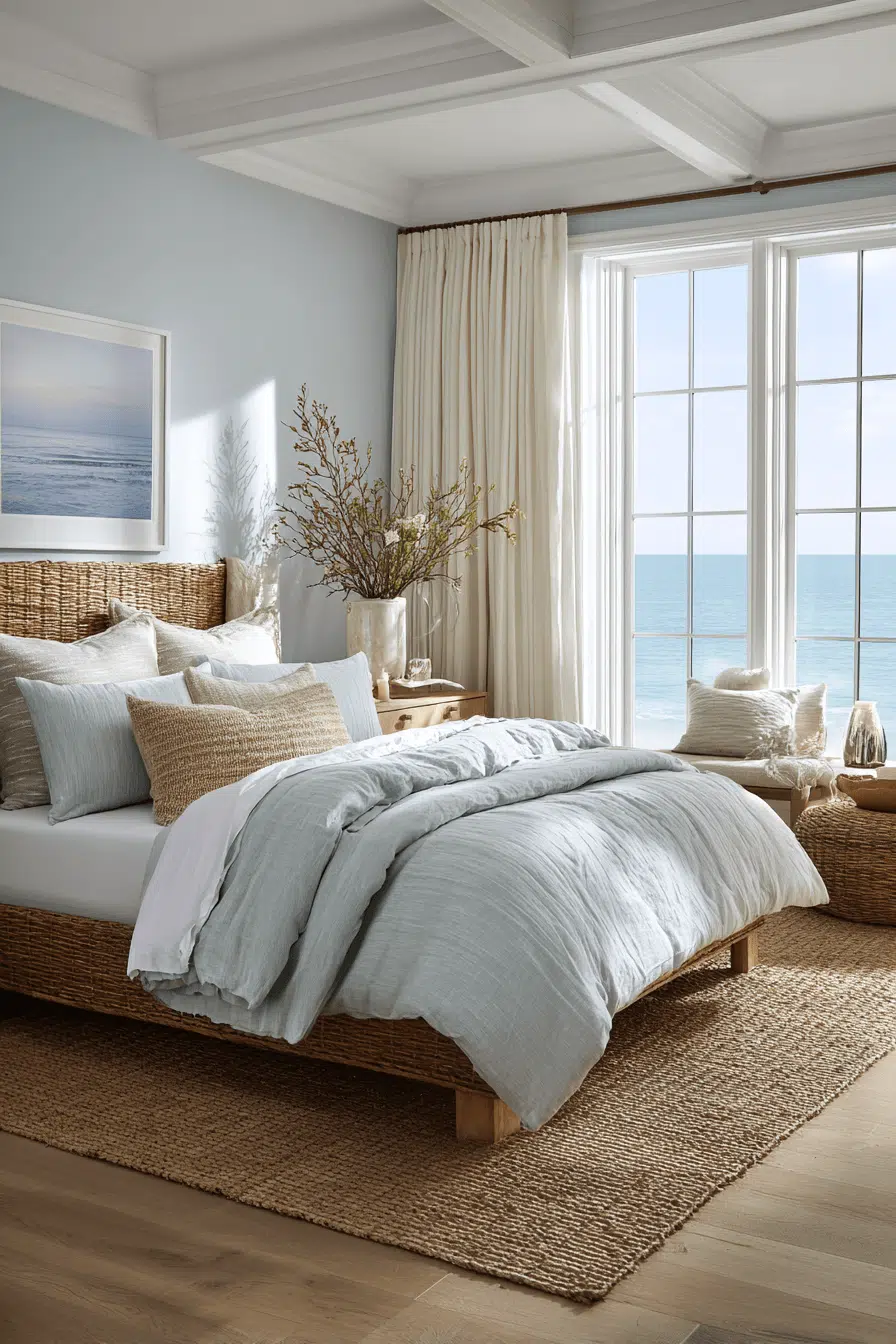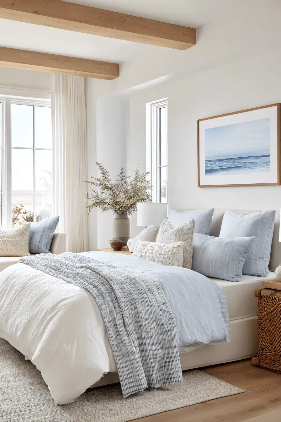 Gentle seaside tones and soft layered fabrics shape this inviting beach house bedroom, creating a space that feels instantly soothing and comfortable. Pale wood finishes blend seamlessly with crisp linens, while plush textures add depth and warmth. Hints of blue appear in decor and textiles, offering a subtle nod to the ocean. Natural light flows freely through airy curtains, brightening every surface. Woven accents introduce a grounded, organic feel. The overall atmosphere is peaceful, light, and effortlessly refined. Get inspired by this relaxing beach house bedroom style!