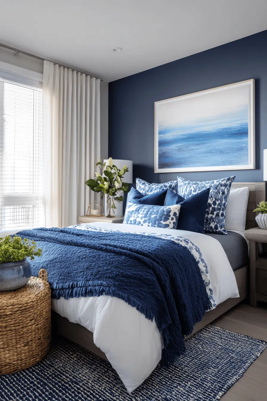 Vibrant coastal colors energize this beach house bedroom while maintaining a balanced and modern feel. Rich blues paired with crisp whites create a dynamic contrast. Sleek furniture ensures the design stays clean and contemporary. Natural textures soften the bold tones. Decorative accents add visual interest without clutter. The space feels lively yet cohesive. Discover this bold beach house bedroom idea!