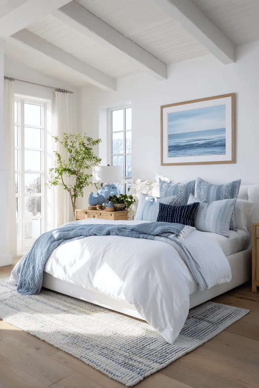 Cool blue layers define this beach house bedroom, creating a refreshing and cohesive look inspired by ocean tones. Crisp white accents maintain brightness. Sleek furniture adds a modern touch. Natural textures soften the palette. The space feels balanced and serene. The atmosphere is calming. Discover this cool-toned beach house bedroom!