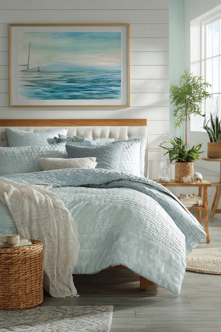 Seafoam tones create a light and airy beach house bedroom that feels effortlessly peaceful. Gentle greens and blues mix with white accents for a balanced palette. Natural materials add warmth. Layered textiles enhance comfort. Light reflects softly throughout the space. The design feels cohesive and calming. Browse this serene beach house bedroom!