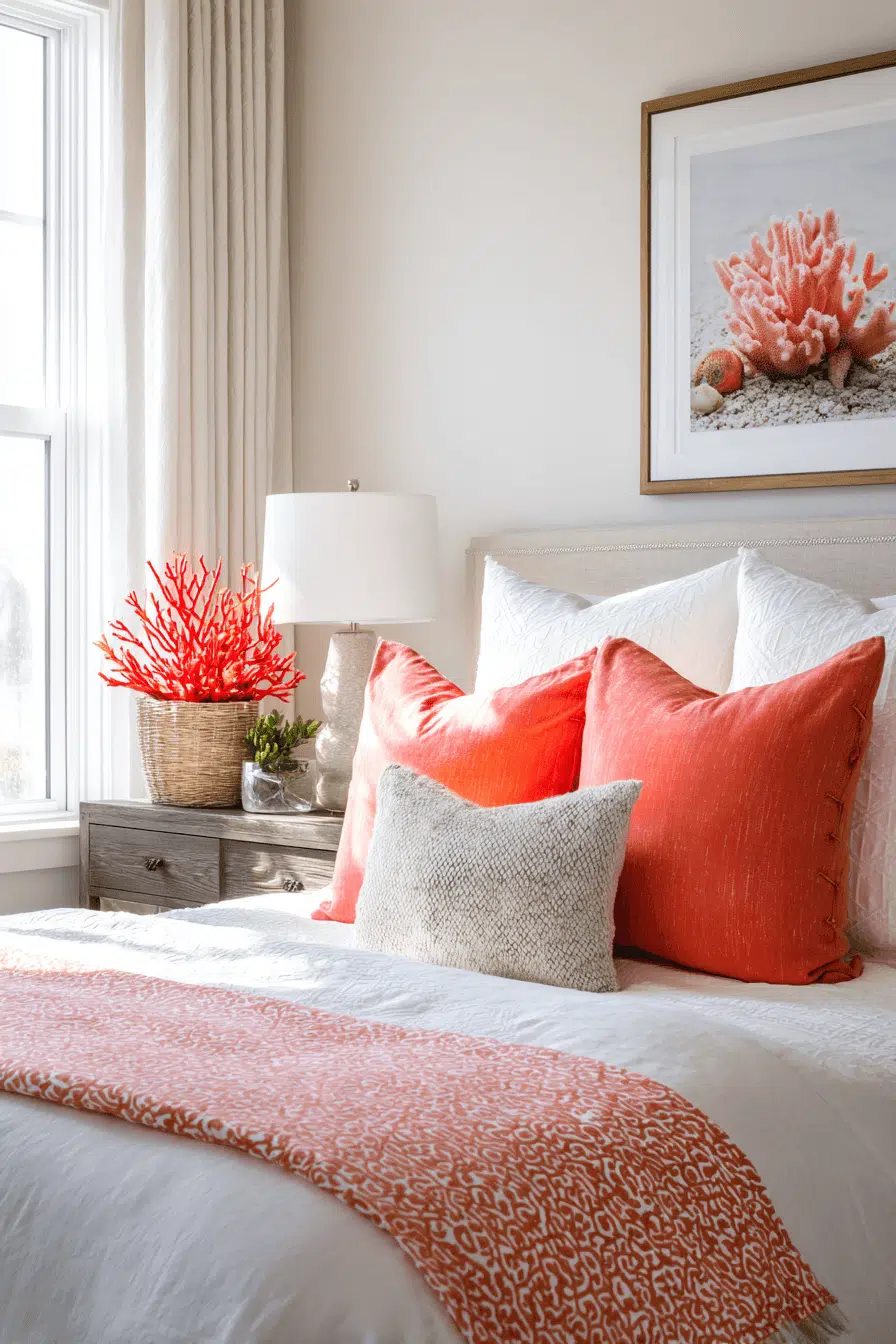 Coral details bring a playful warmth into this beach house bedroom, adding personality without overwhelming the design. Pops of color contrast beautifully with neutral surroundings. Modern furniture keeps the space clean and polished. Natural textures balance the palette. Thoughtful accents create visual harmony. The atmosphere feels cheerful and inviting. Browse this vibrant beach house bedroom!