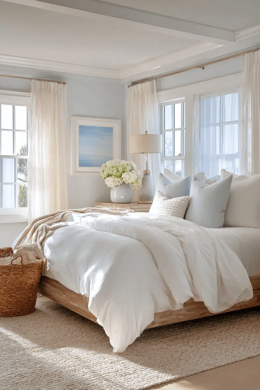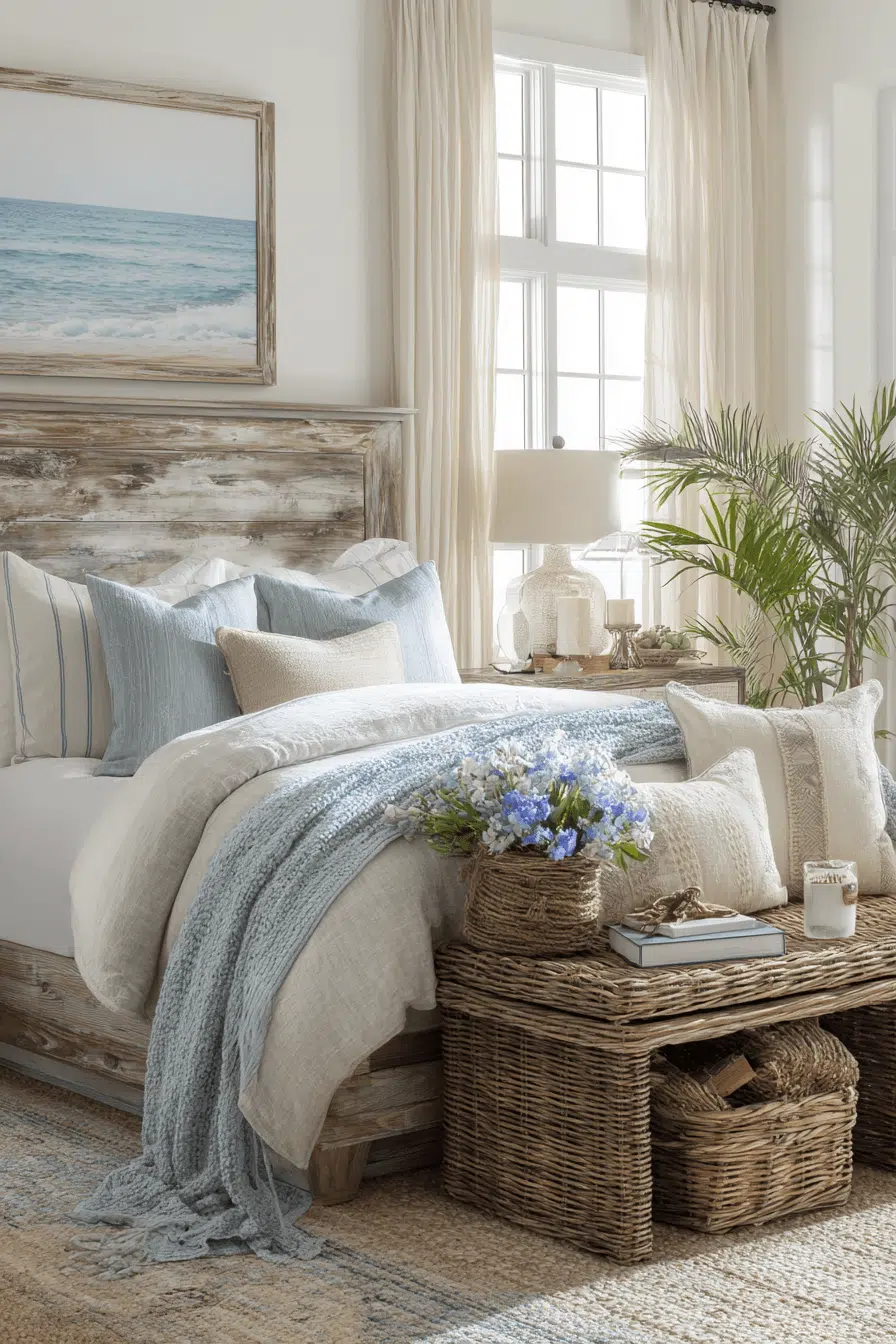Breezy coastal influences shape these guest bedroom ideas into light, relaxing spaces inspired by the shore. Soft blues and sandy tones create a calming palette. Textured fabrics add subtle depth. The design feels casual yet refined. Perfect for year-round comfort. Guests will enjoy the airy feel. Bring coastal calm into your guest room!
