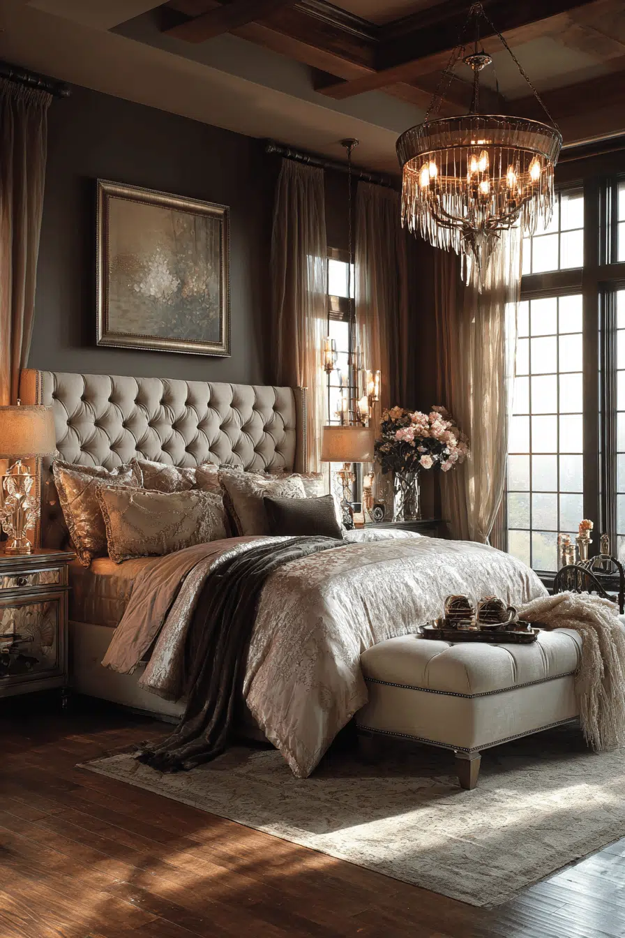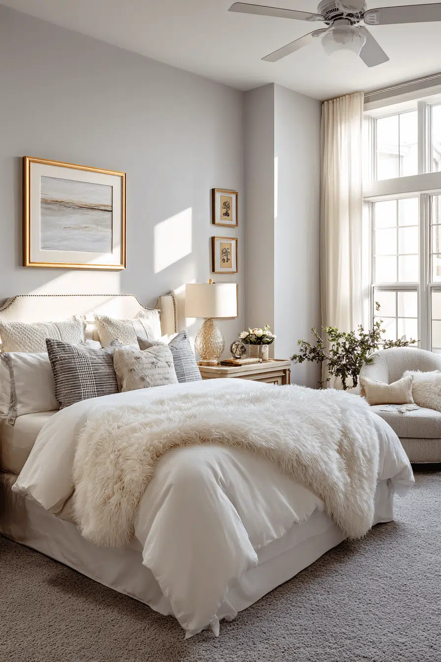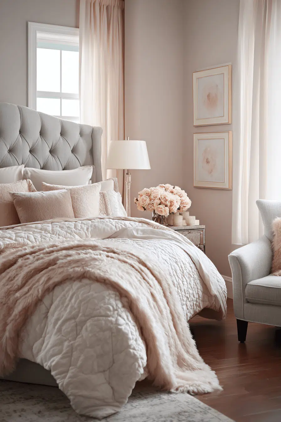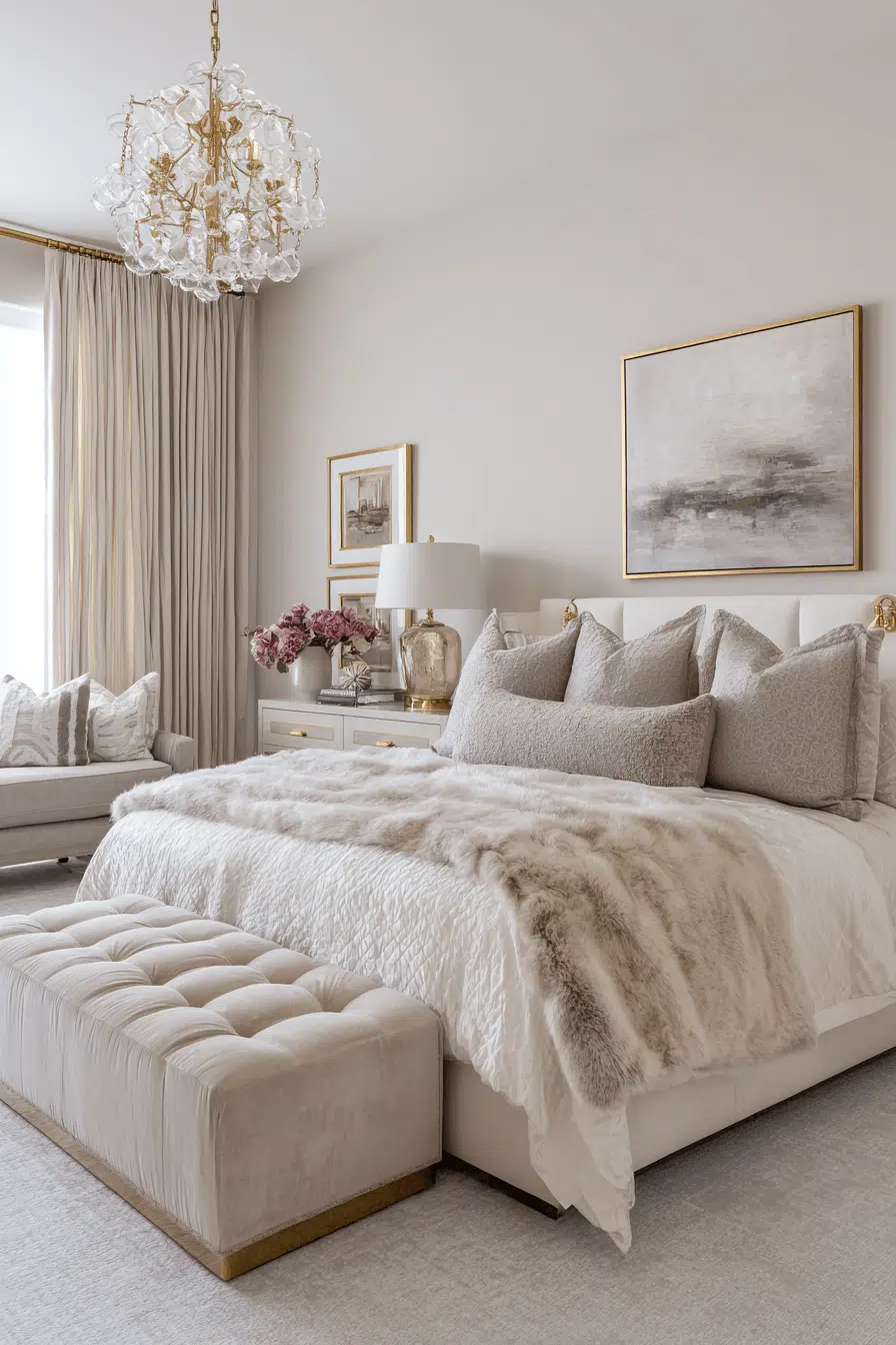 Soft neutral tones paired with subtle details create these guest bedroom ideas that feel polished and luxurious. Beige, gray, and cream hues provide a calming base. Metallic accents add a touch of sophistication. Plush bedding enhances comfort. The design feels elegant and welcoming. Guests will feel pampered. Create a refined guest experience at home!