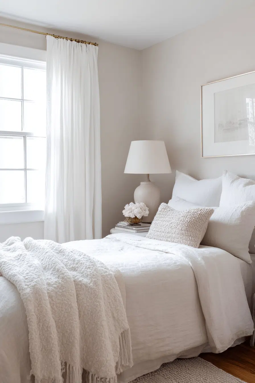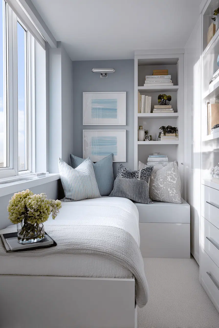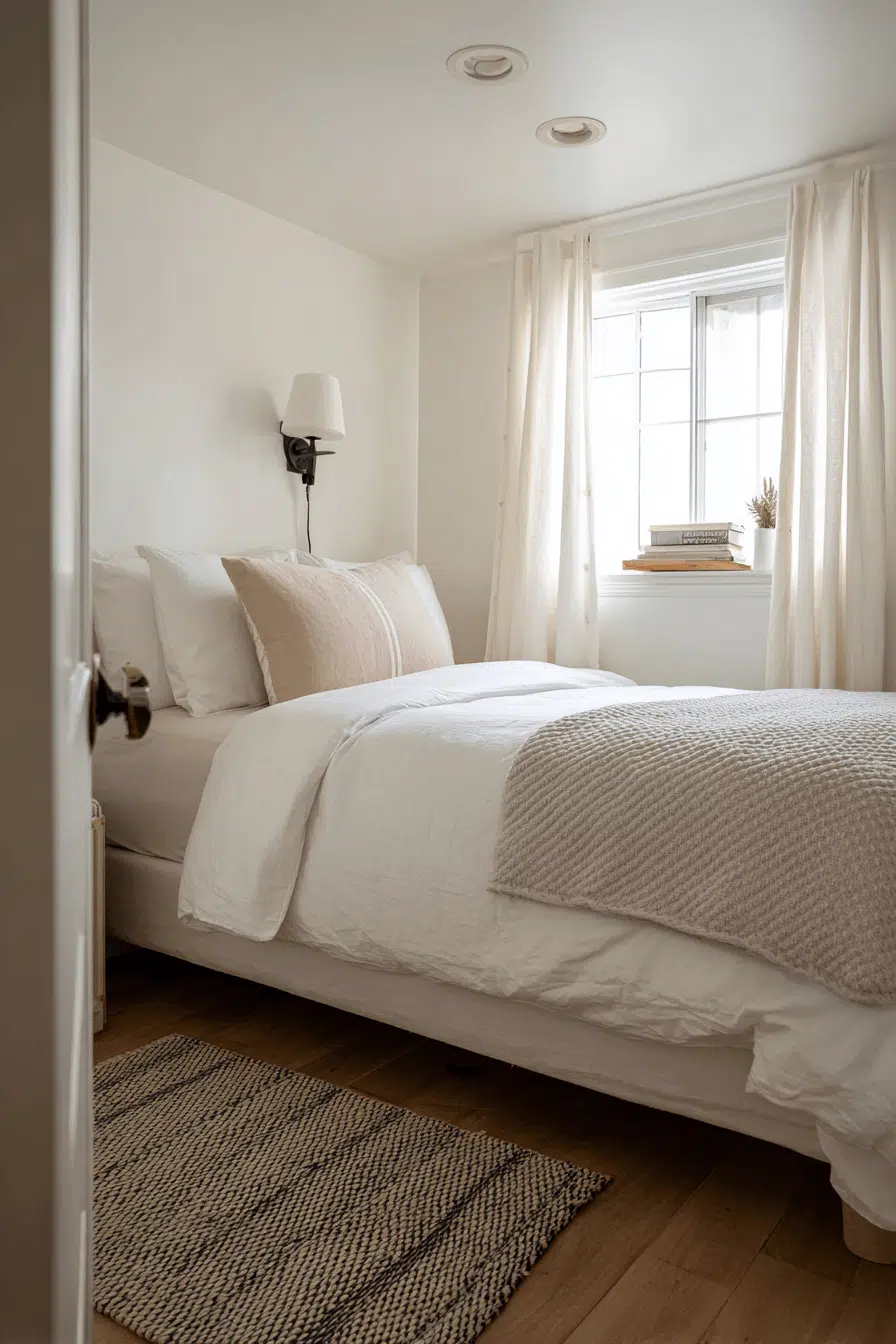Bright white styling enhances these small guest bedroom ideas by making spaces feel larger and more open. Layered whites add subtle depth. Textures keep the design interesting. Light wood accents soften the look. The space feels clean and refreshing. Perfect for maximizing light. Refresh your room with this bright approach!