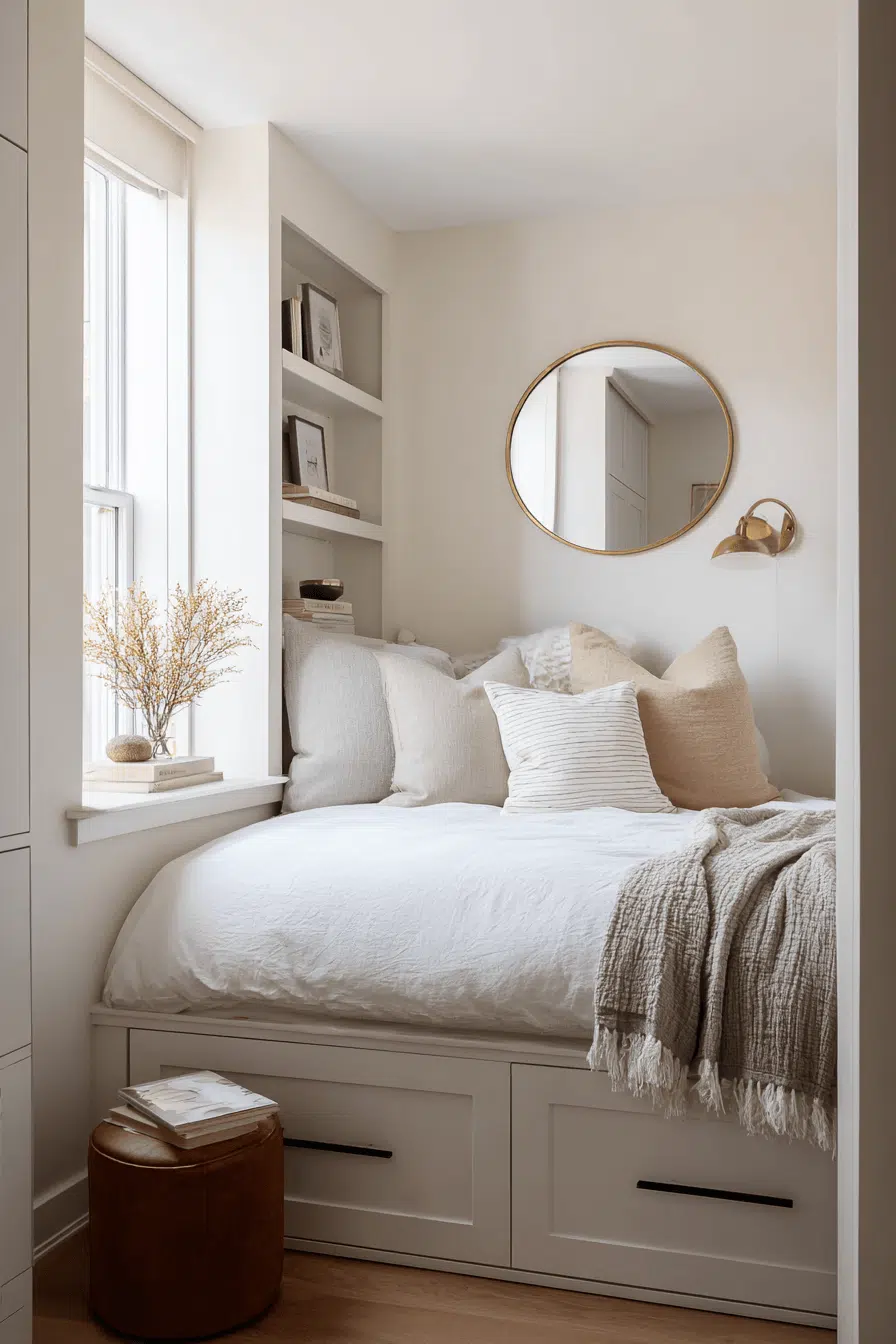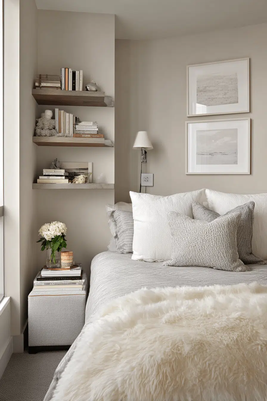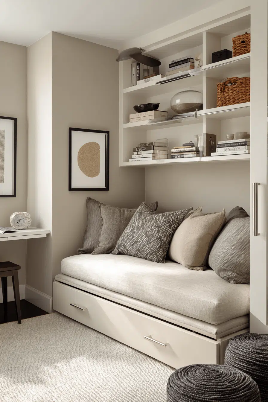 Neutral palettes create openness in these small guest bedroom ideas that feel both warm and inviting. Beige, ivory, and soft gray tones reflect light beautifully. Layered textures add depth without clutter. The design feels relaxed and balanced. Guests will feel comfortable instantly. Transform your space with neutral elegance!