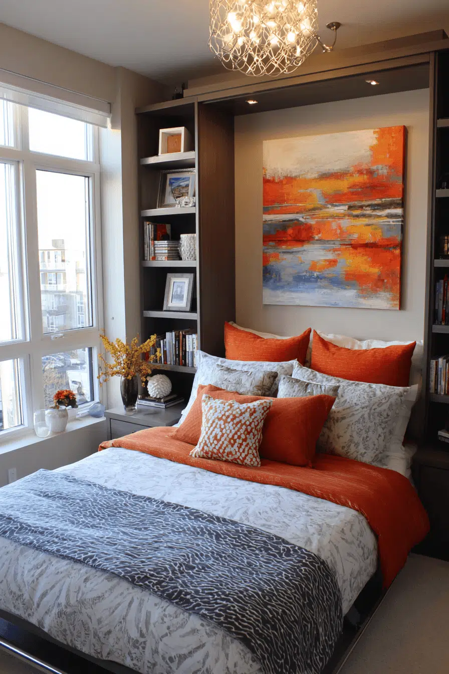 Creative expression shines through these small guest bedroom ideas with bold design elements that add drama and personality. Unique lighting and rich fabrics create visual interest. Thoughtful decor keeps the space cohesive. The room feels curated and stylish. Even compact layouts can feel impactful. Guests will notice the design. Make a bold statement today!