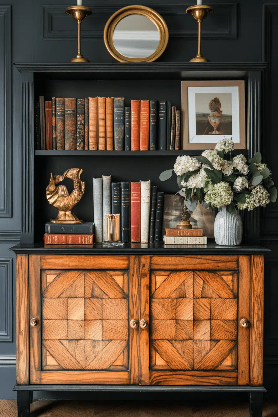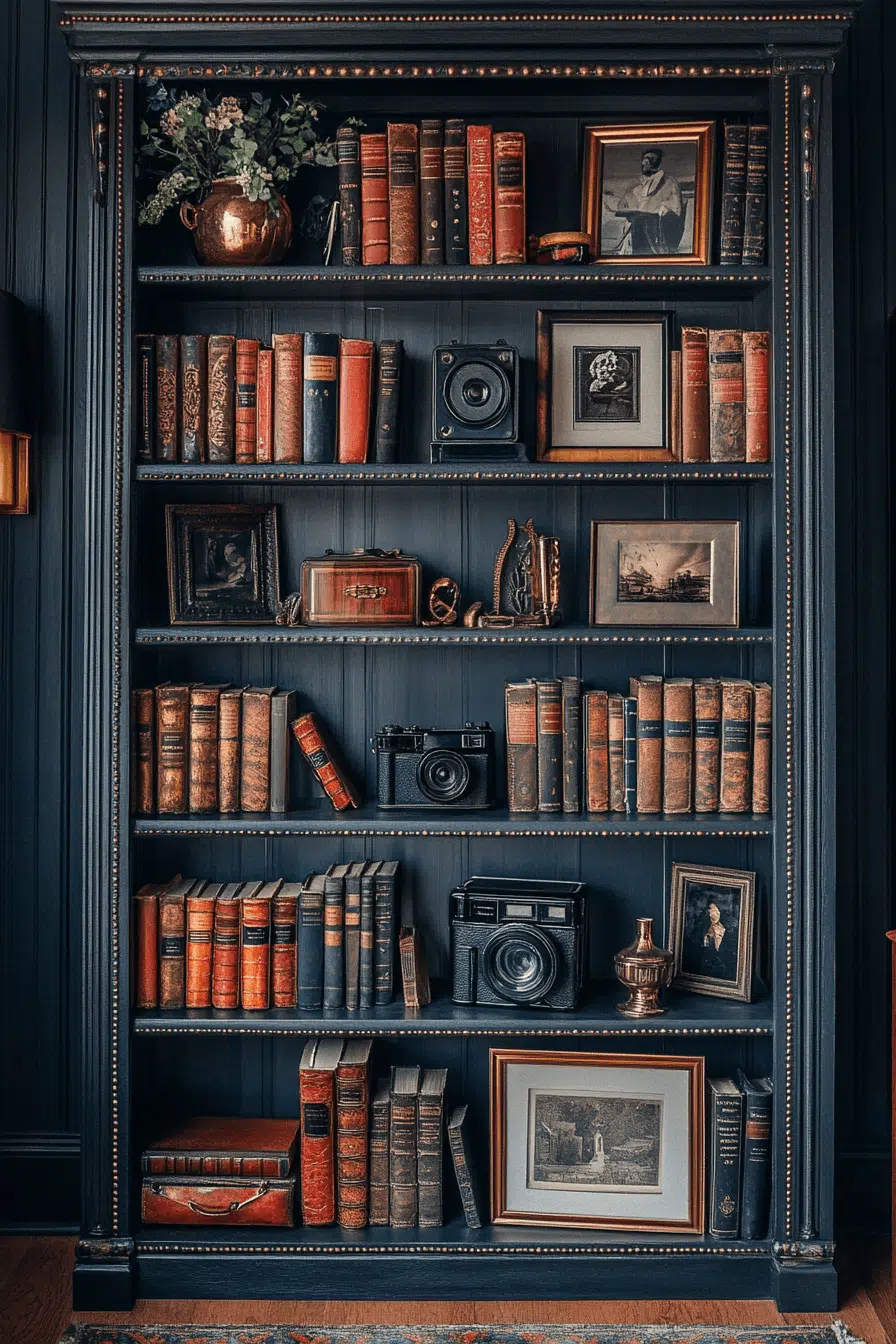 A Deco-influenced bookcase blends vintage glamour with geometric precision in an antique bookshelf mix. Clean lines and glossy finishes create a striking yet elegant silhouette. Metallic inlays or lacquered surfaces reflect light with sophistication. Styled with curated objets d’art, it bridges eras seamlessly. An antique bookshelf enriched with Deco elements feels polished and bold. Click to introduce streamlined vintage flair into your reading space!