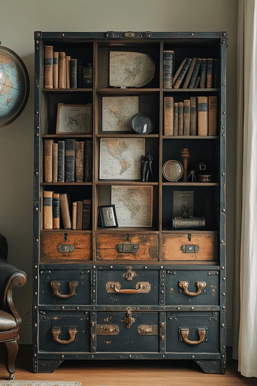 A repurposed vintage trunk shelf brings imaginative storytelling into an antique bookshelf composition. Leather straps and brass corners echo journeys of the past. The compartmentalized design offers both storage and character. Compact proportions make it ideal for cozy corners or creative studios. An antique bookshelf infused with travel-inspired charm feels personal and unique. Click to showcase your books within a storied silhouette!