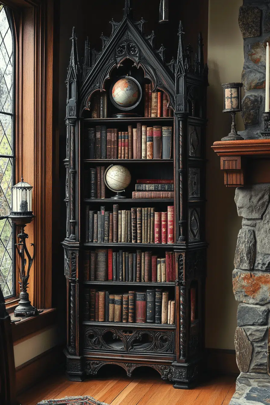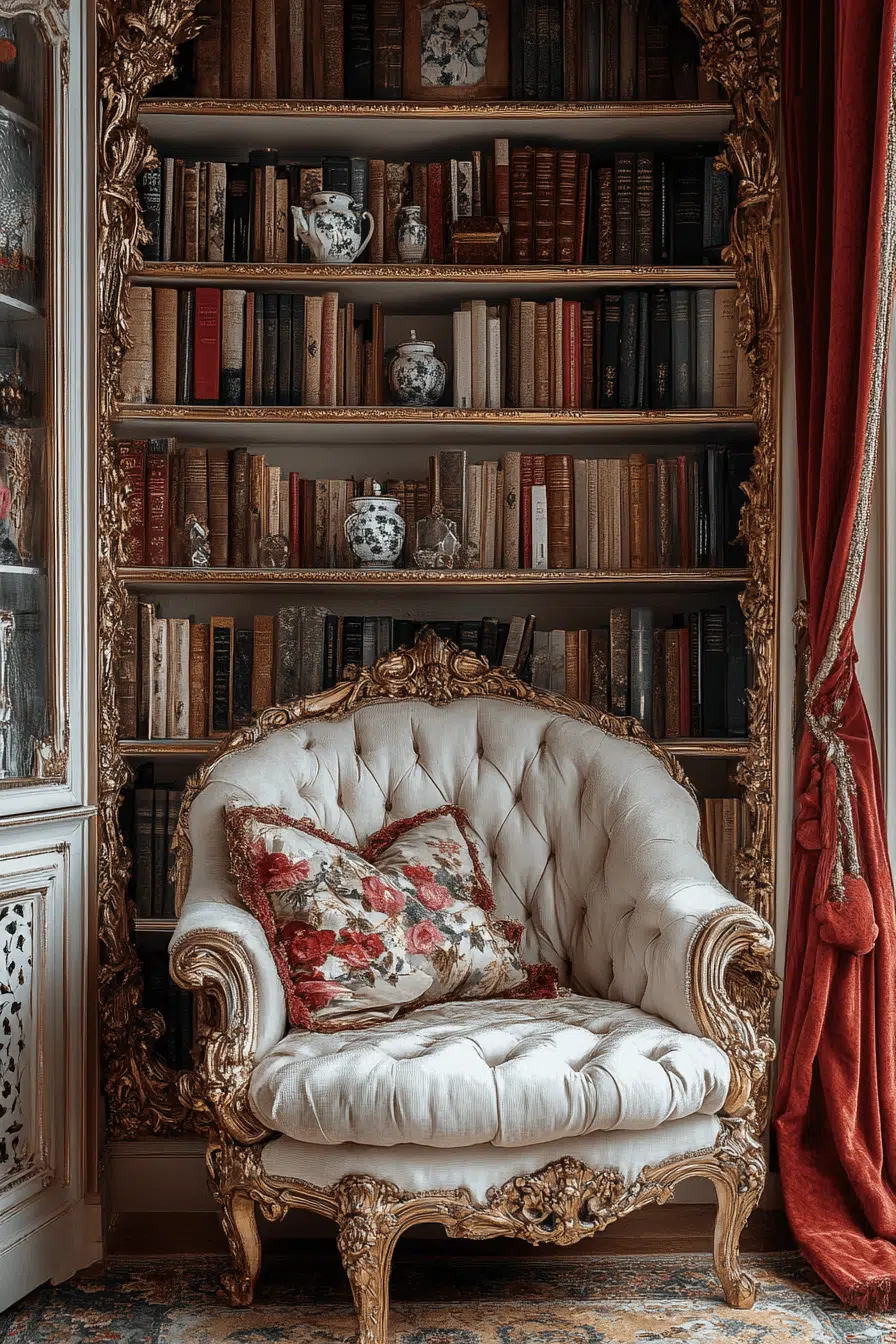 A Baroque-inspired display niche transforms an antique bookshelf corner into a theatrical escape. Elaborate carvings and gilded flourishes frame treasured volumes. Rich finishes and scrolling motifs amplify the room’s opulence. Styled with tufted seating nearby, it becomes a dramatic reading retreat. An antique bookshelf accented with ornate details radiates classic luxury. Tap to indulge in decorative grandeur!