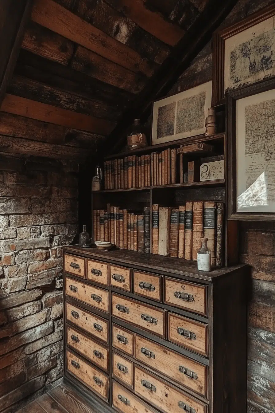 An apothecary-style shelving cabinet merges utility and charm in an antique bookshelf configuration. Multiple small drawers and cubbies invite organized styling. Warm wood tones and label pulls enhance authenticity. Display books alongside jars, inkwells, or collectibles for layered texture. An antique bookshelf arrangement benefits from functional artistry. Tap to organize your space with vintage appeal!