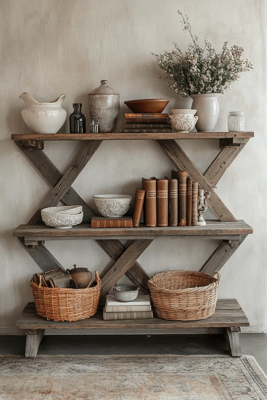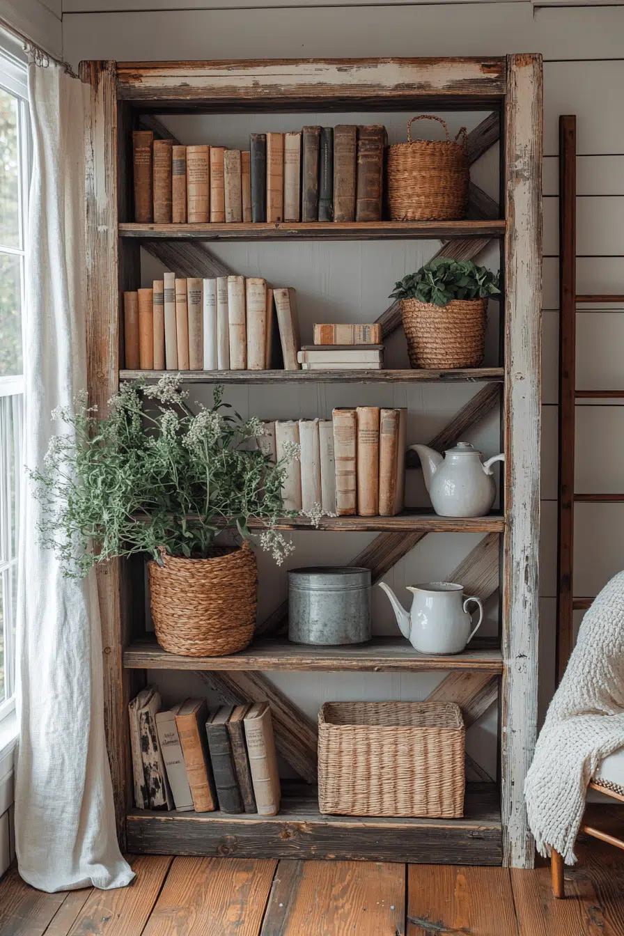 An open-frame farmhouse bookcase creates breezy charm within an antique bookshelf layout. Exposed beams and cross braces keep the structure visually light. Styled with crockery and weathered novels, it feels welcoming and approachable. Its airy design works well in transitional or country-inspired interiors. An antique bookshelf doesn’t need heaviness to feel historic. Tap to embrace relaxed rustic character!