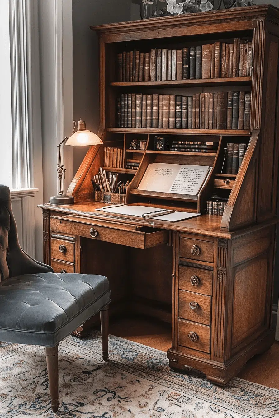 An antique secretary cabinet merges bookshelf and workspace seamlessly. The fold-down writing surface adds practical versatility. Upper shelves display treasured volumes while hidden compartments store essentials. Rich wood tones emphasize heritage craftsmanship. An antique bookshelf that doubles as a desk feels both purposeful and storied. Tap to transform your reading corner into a refined study!