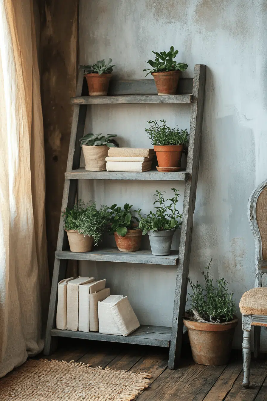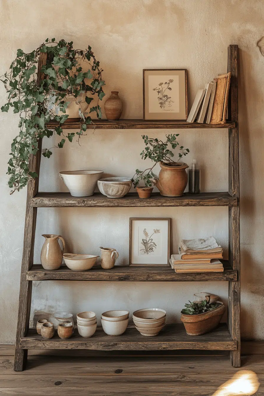 A rustic leaning ladder shelf offers casual charm within an antique bookshelf layout. Its angled frame and gently worn planks evoke repurposed farmhouse finds. The open design keeps the display feeling light while still providing vertical storage. Styled with vintage jars, worn novels, or trailing greenery, it feels curated yet relaxed. An antique bookshelf arrangement benefits from pieces that balance structure and simplicity. Click to lean into effortless heritage style!