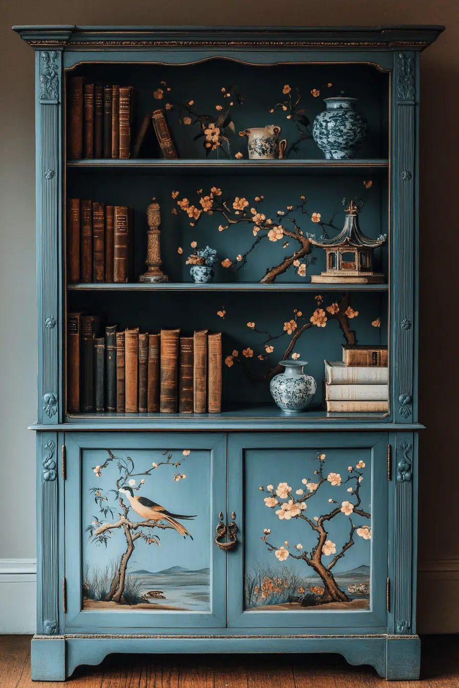 A lacquered Chinoiserie cabinet bookshelf introduces global artistry into an antique bookshelf arrangement. Hand-painted motifs and gold accents turn the piece into a statement artwork. Enclosed lower storage balances open upper shelves. It pairs beautifully with curated ceramics and delicate decor. An antique bookshelf enriched with cultural detail feels collected and expressive. Tap to showcase worldly sophistication!