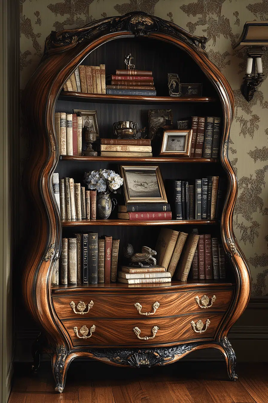 A bombe-style shelving unit brings dramatic curves into an antique bookshelf lineup. Rounded drawer fronts and cabriole legs create visual movement. Hand-painted or richly stained finishes amplify personality. Open shelving above softens the silhouette with balance. An antique bookshelf infused with Rococo curves feels lively and sophisticated. Tap to add graceful dimension to your display!